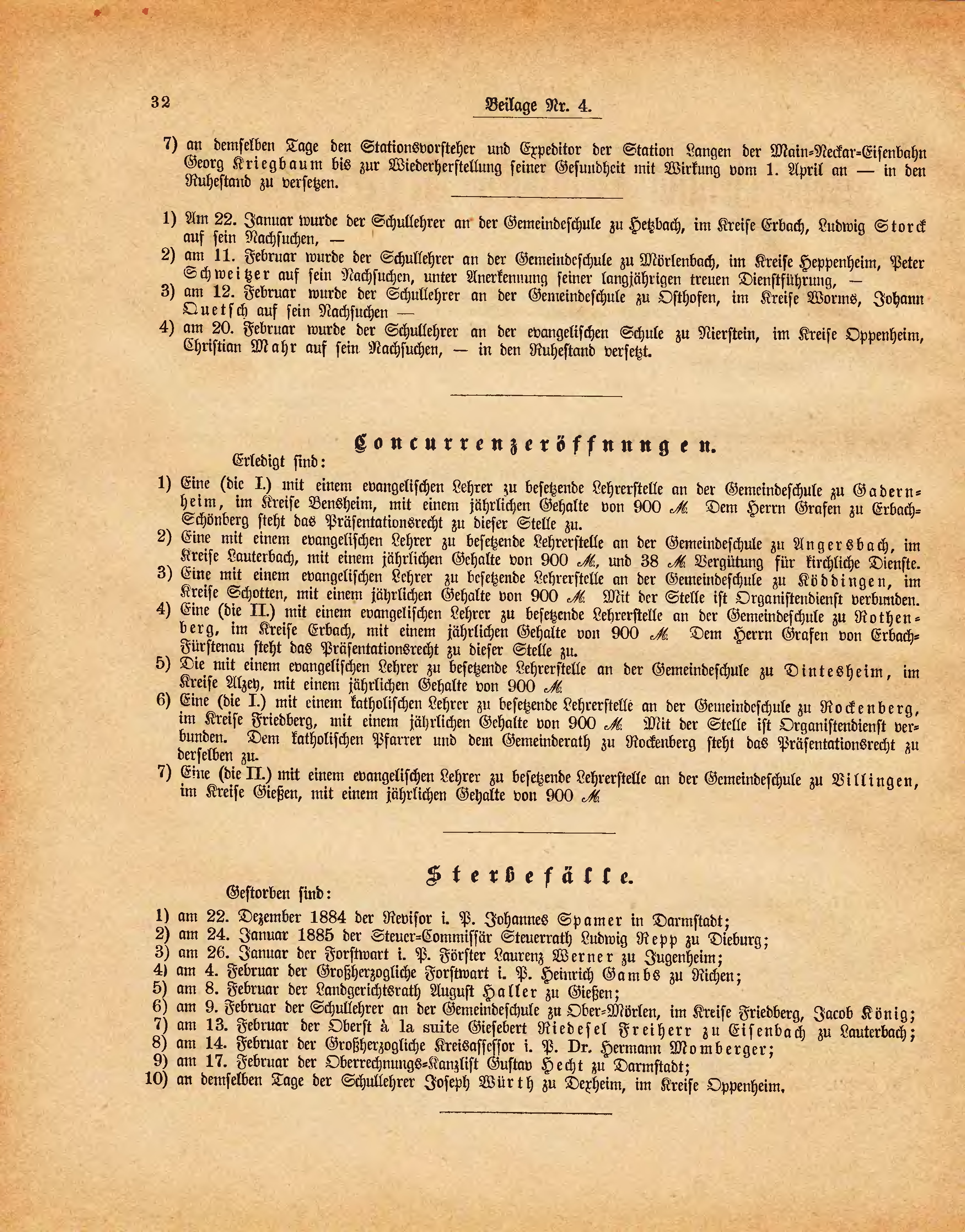 | 2) | am 11. Februar wurde der Schullehrer an der Gemeindeschule zu Mörlenbach, im Kreise Heppenheim, Peter Schweitzer auf sein Nachsuchen, unter Anerkennung seiner langjährigen treuen Dienstführung, - | ||