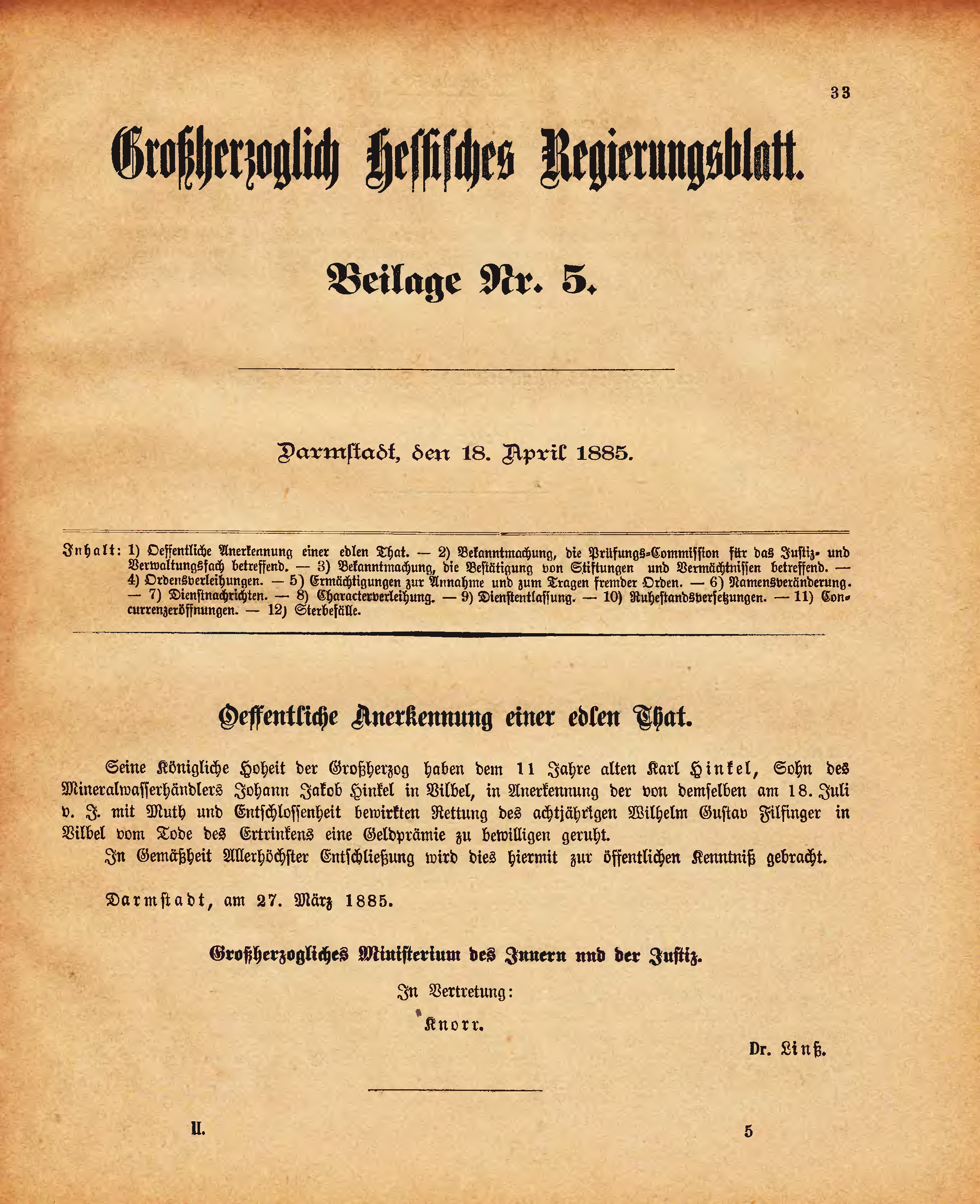Seine Königliche Hoheit der Großherzog haben dem 11 Jahre alten Karl Hinkel, Sohn des Mineralwasserhändlers Johann Jakob Hinkel in Vilbel, in Anerkennung der von demselben am 18. Juli v. J. mit Muth und Entschlossenheit bewirkten Rettung des achtjährigen Wilhelm Gustav Filfinger in Vilbel vom Tode des Ertrinkens eine Geldprämie zu bewilligen geruht.