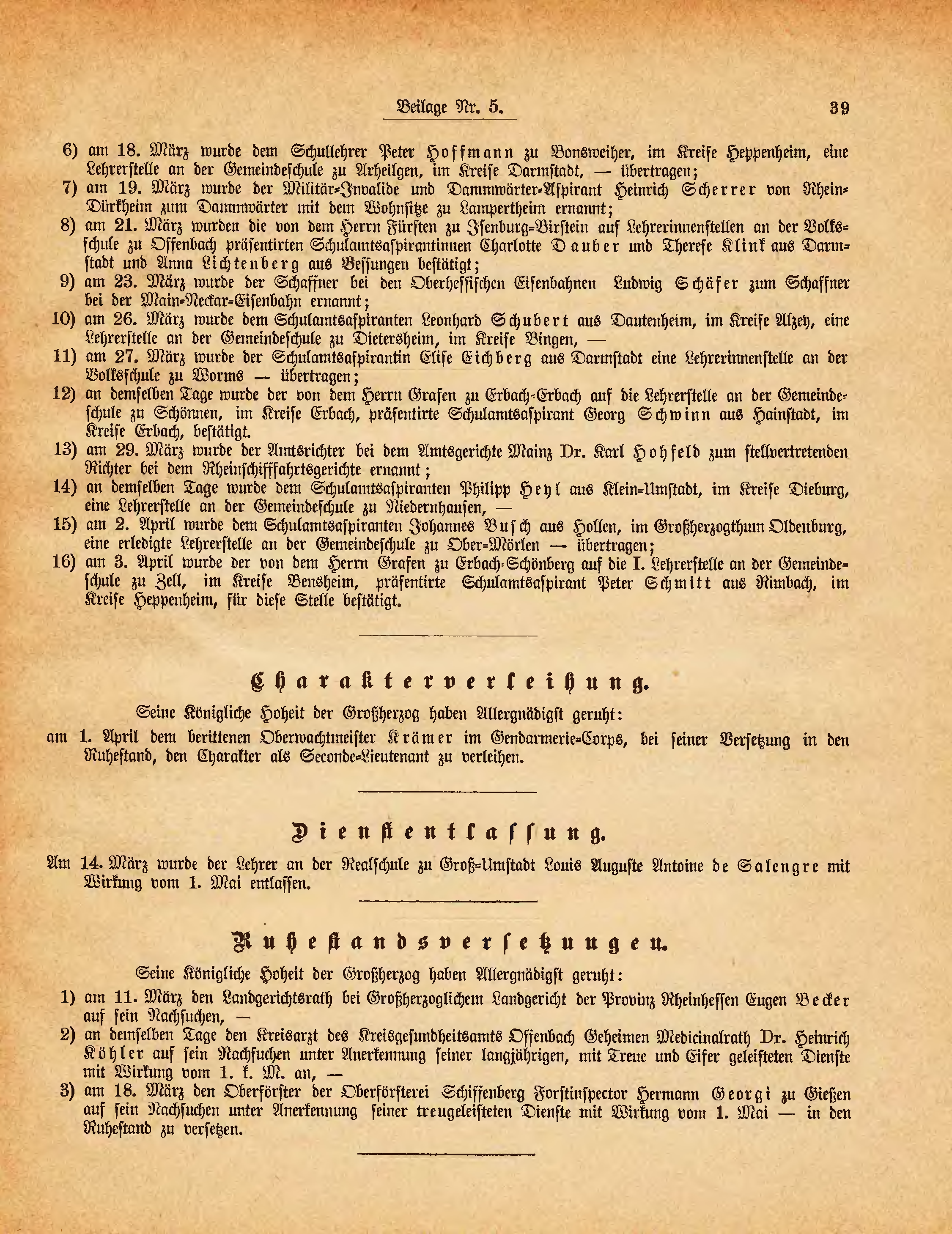 | 6) | am 18. März wurde dem Schullehrer Peter Hoffmann zu Bonsweiher, im Kreise Heppenheim, eine Lehrerstelle an der Gemeindeschule zu Arheilgen, im Kreise Darmstadt, - übertragen; | ||