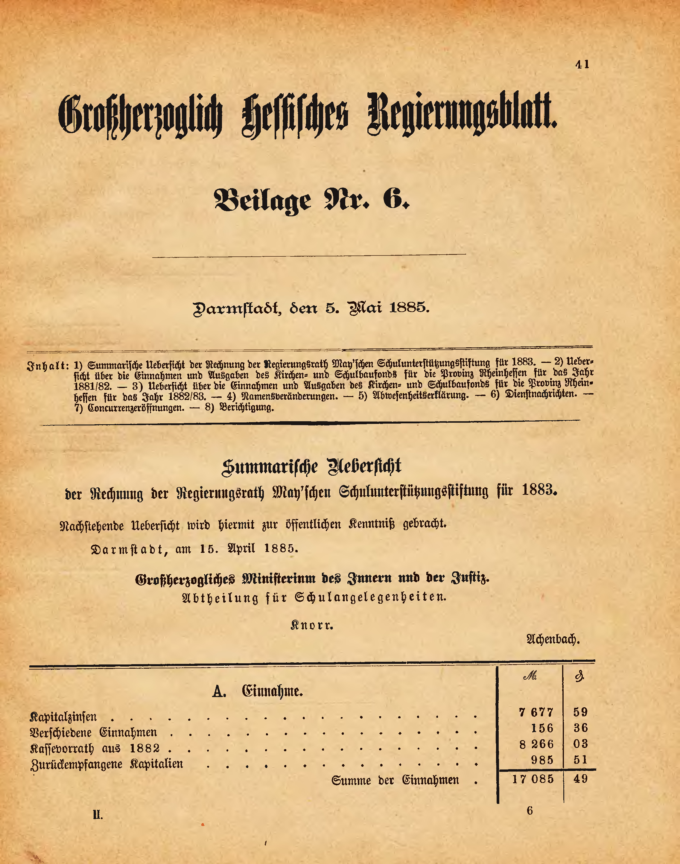 | Inhalt: | 1) Summarische Uebersicht der Rechnung der Regierungsrath May`schen Schulunterstützungsstiftung für 1883. - 2) Uebersicht über die Einnahmen und Ausgaben des Kirchen- und Schulbaufonds für die Provinz Rheinhessen für das Jahr 1881/82. - 3) Uebersicht über die Einnahmen und Ausgaben des Kirchen- und Schulbaufonds für die Provinz Rheinhessen für das Jahr 1882/83. - 4) Namensveränderungen. - 5) Abwesenheitserklärung. - 6) Dienstnachrichten. - 7) Concurrenzeröffnungen. - 8) Berichtigung. |