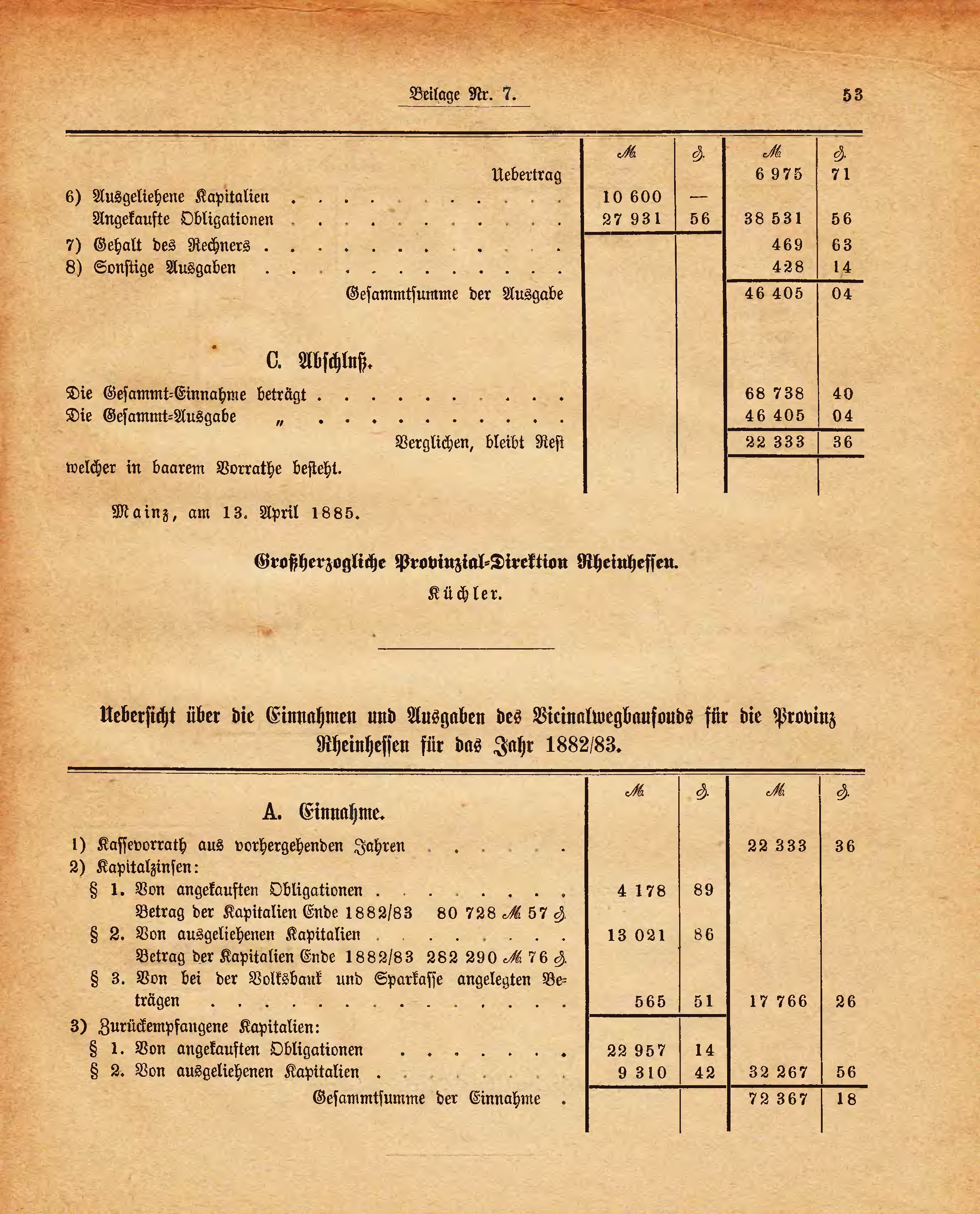 Uebersicht über die Einnahmen und Ausgaben des Vicinalwegbaufonds für die Provinz Rheinhessen für das Jahr 1882/83.