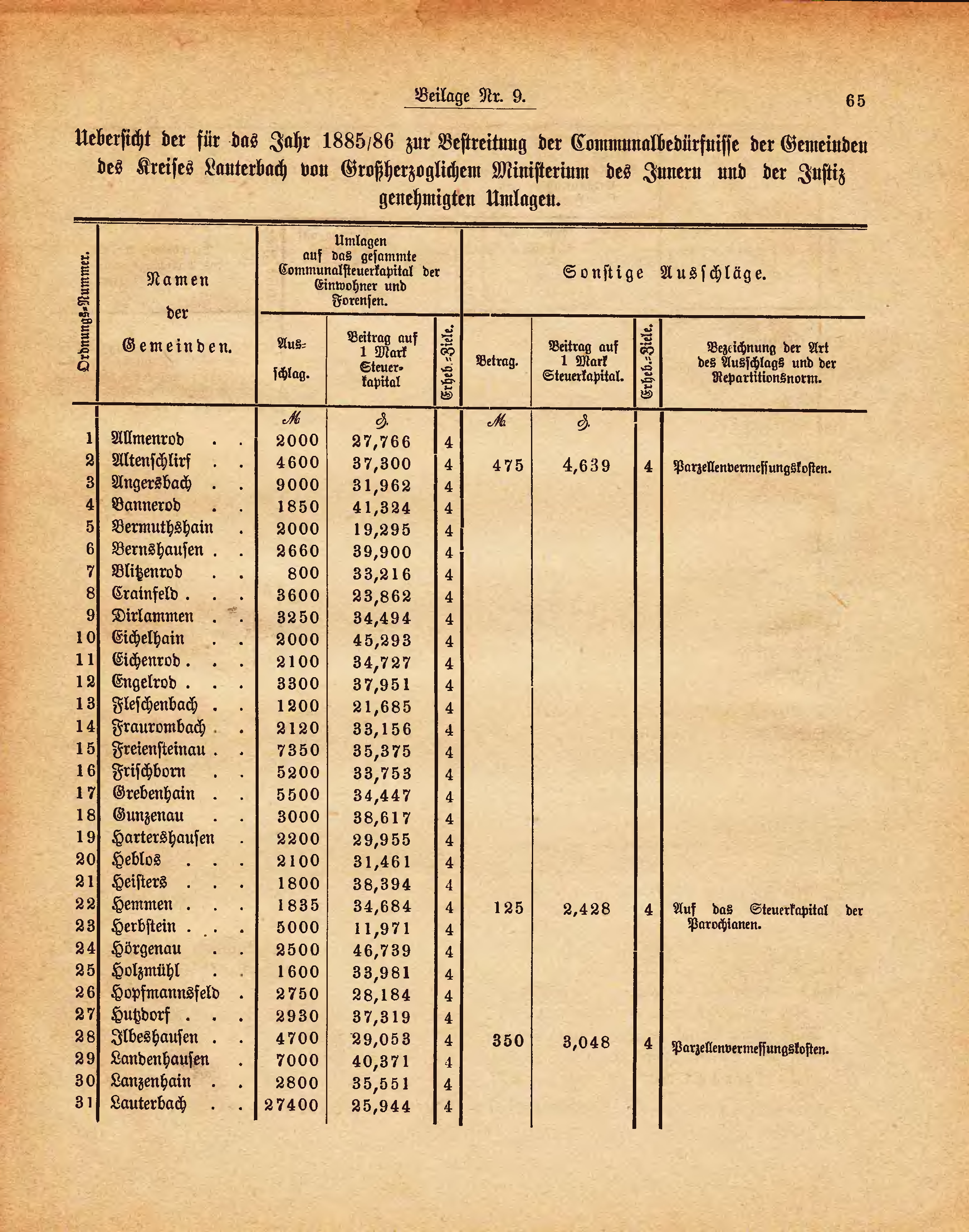 Uebersicht der für das Jahr 1885/86 zur Bestreitung der Communalbedürfnisse der Gemeinden des Kreises Lauterbach von Großherzoglichem Ministerium des Innern und der Justiz genehmigten Umlagen.