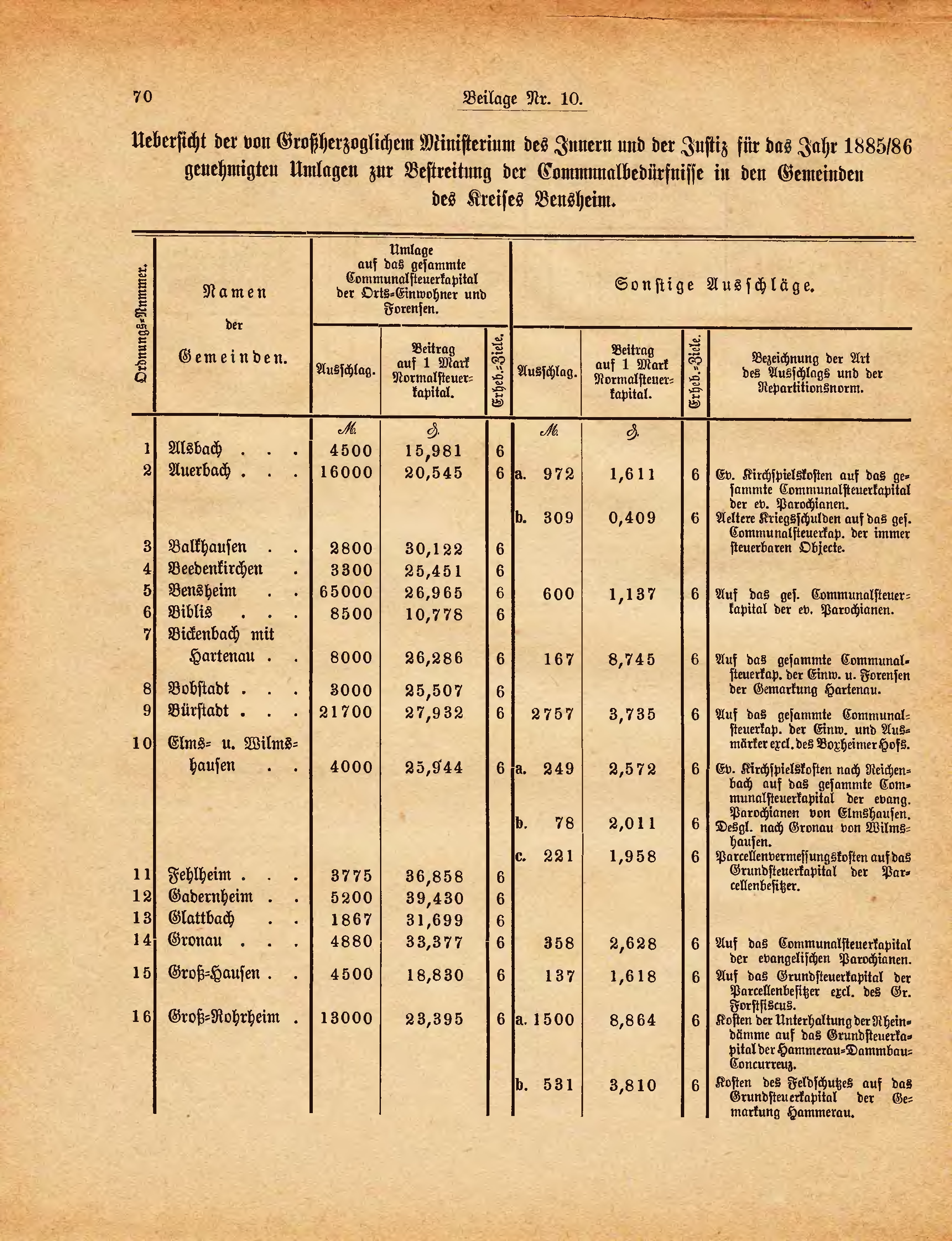 Uebersicht der von Großherzoglichem Ministerium des Innern und der Justiz für das Jahr 1885/86 genehmigten Umlagen zur Bestreitung der Communalbedürfnisse in den Gemeinden des Kreises Bensheim.