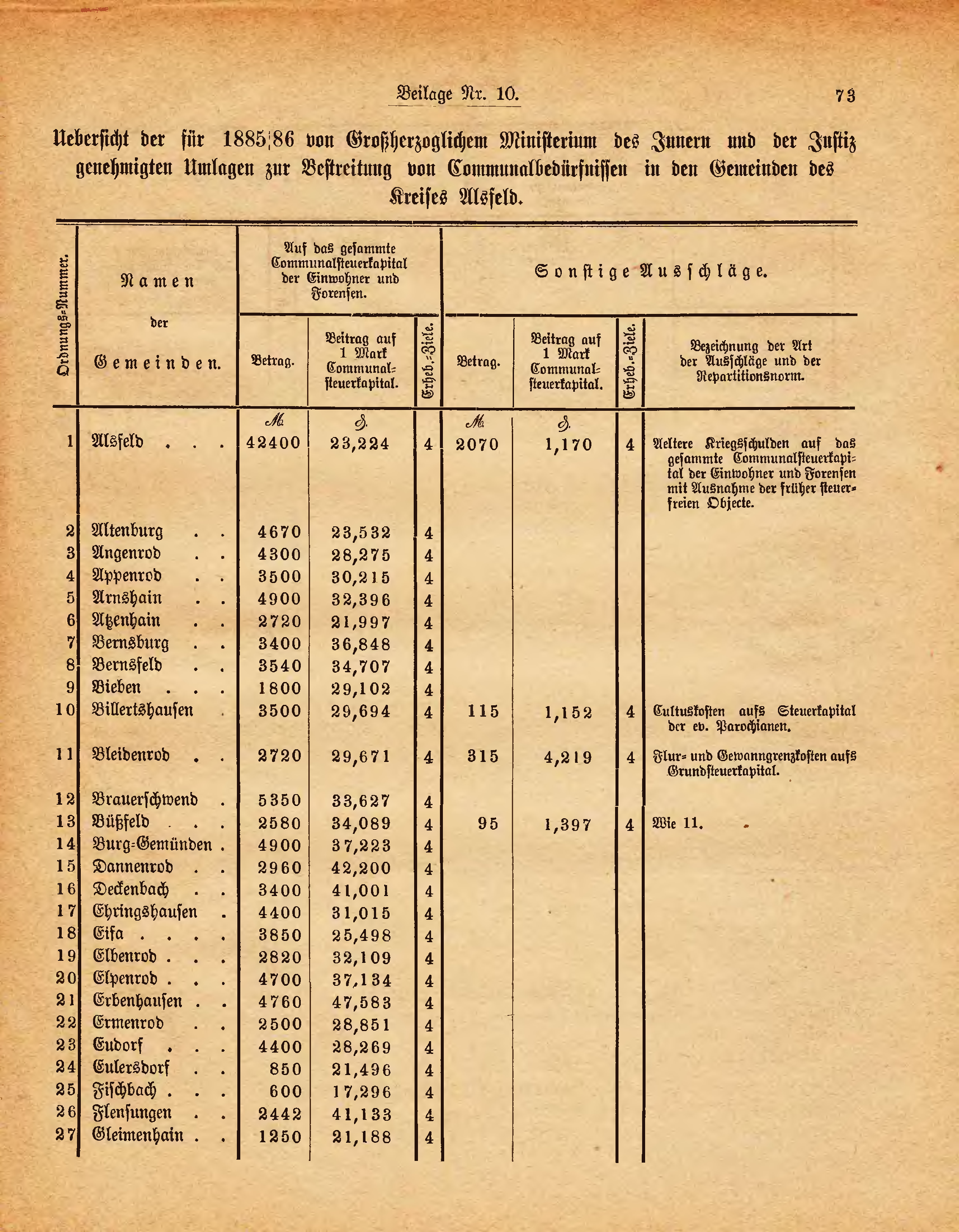 Uebersicht der für 1885/86 von Großherzoglichem Ministerium des Innern und der Justiz genehmigten Umlagen zur Bestreitung von Communalbedürfnissen in den Gemeinden des Kreises Alsfeld.