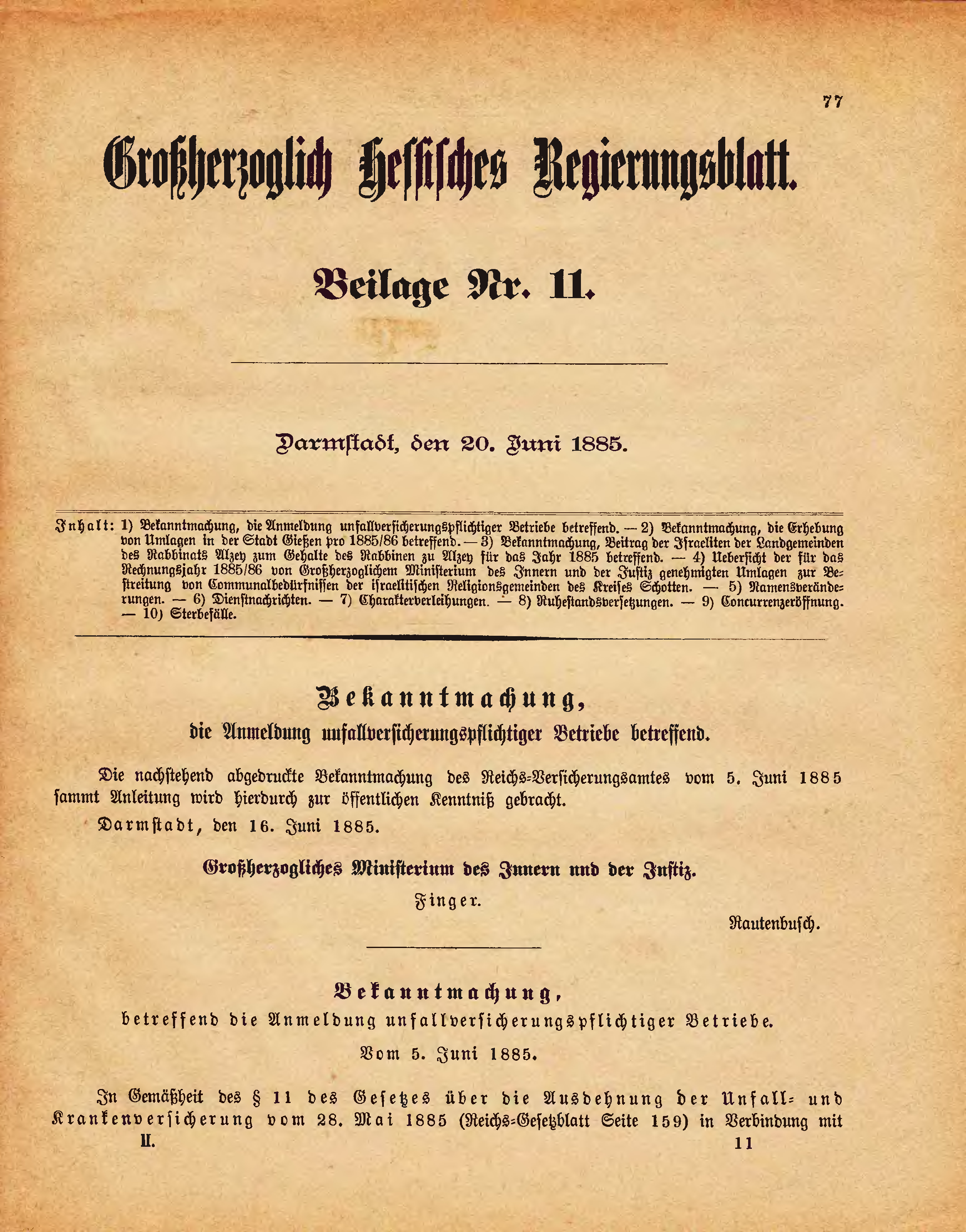 | Inhalt: | 1) Bekanntmachung, die Anmeldung unfallversicherungspflichtiger Betriebe betreffend. - 2) Bekanntmachung, die Erhebung von Umlagen in der Stadt Gießen pro 1885/86 betreffend. - 3) Bekanntmachung, Beitrag der Israeliten der Landgemeinden des Rabbinats Alzey zum Gehalte de Rabbinen zu Alzey für das Jahr 1885 betreffend. - 4) Uebersicht der für das Rechnungsjahr 1885/86 von Großherzoglichem Ministerium des Innern und der Justiz genehmigten Umlagen zur Bestreitung von Communalbedürfnissen der israelitischen Religionsgemeinden des Kreises Schotten. - 5) Namensveränderungen. - 6) Dienstnachrichten. - 7) Charakterverleihungen. - 8) Ruhestandsversetzungen. - 9) Concurrenzeröffnung. - 10) Sterbefälle. |