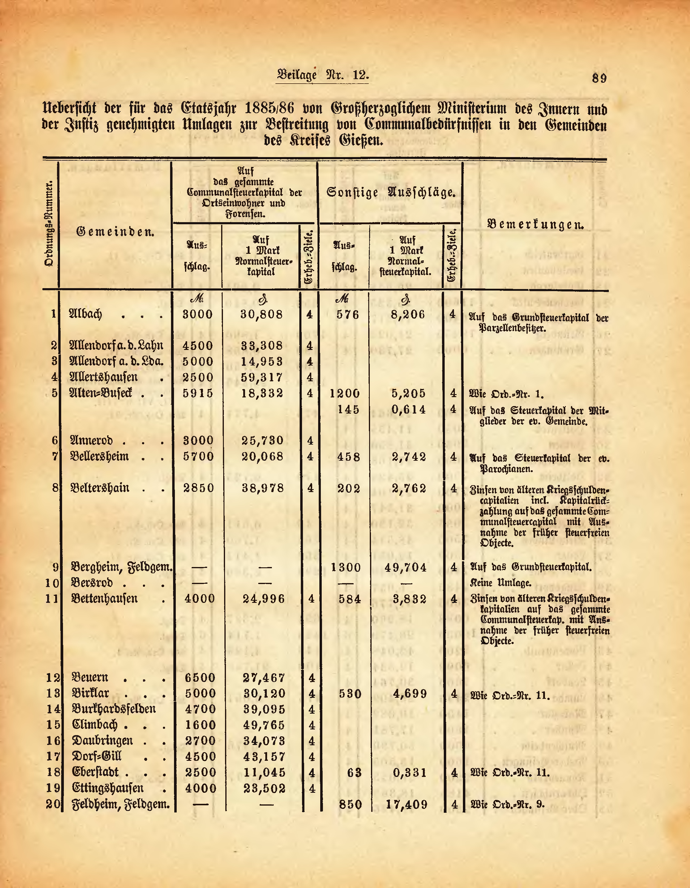 Uebersicht der für das Etatsjahr 1885/86 von Großherzoglichen Ministerium des Innern und der Justiz genehmigten Umlagen zur Bestreitung von Communalbedürfnissen in den Gemeinden des Kreises Gießen.