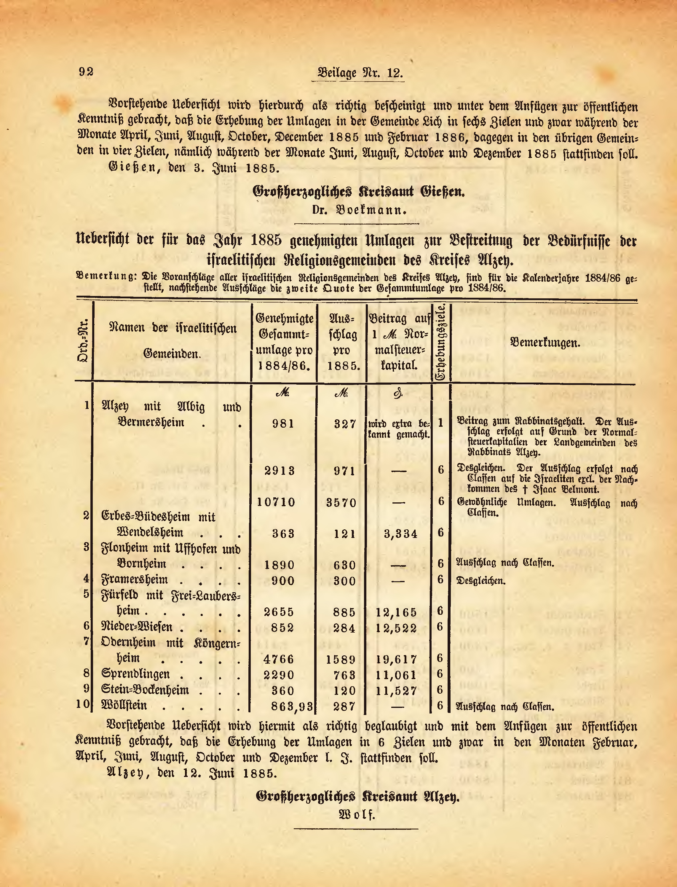 Vorstehende Uebersicht wird hierdurch als richtig bescheinigt Und unter dem Anfügen zur öffentlichen Kenntniß gebracht, daß die Erhebung der Umlagen in der Gemeinde Lich in sechs Zielen und zwar während der Monate April, Juni, August, October, December 1885 und Februar 1886, dagegen in den übrigen Gemeinden in vier Zielen, nämlich während der Monate Juni, August, October und Dezember 1885 stattfinden soll.
