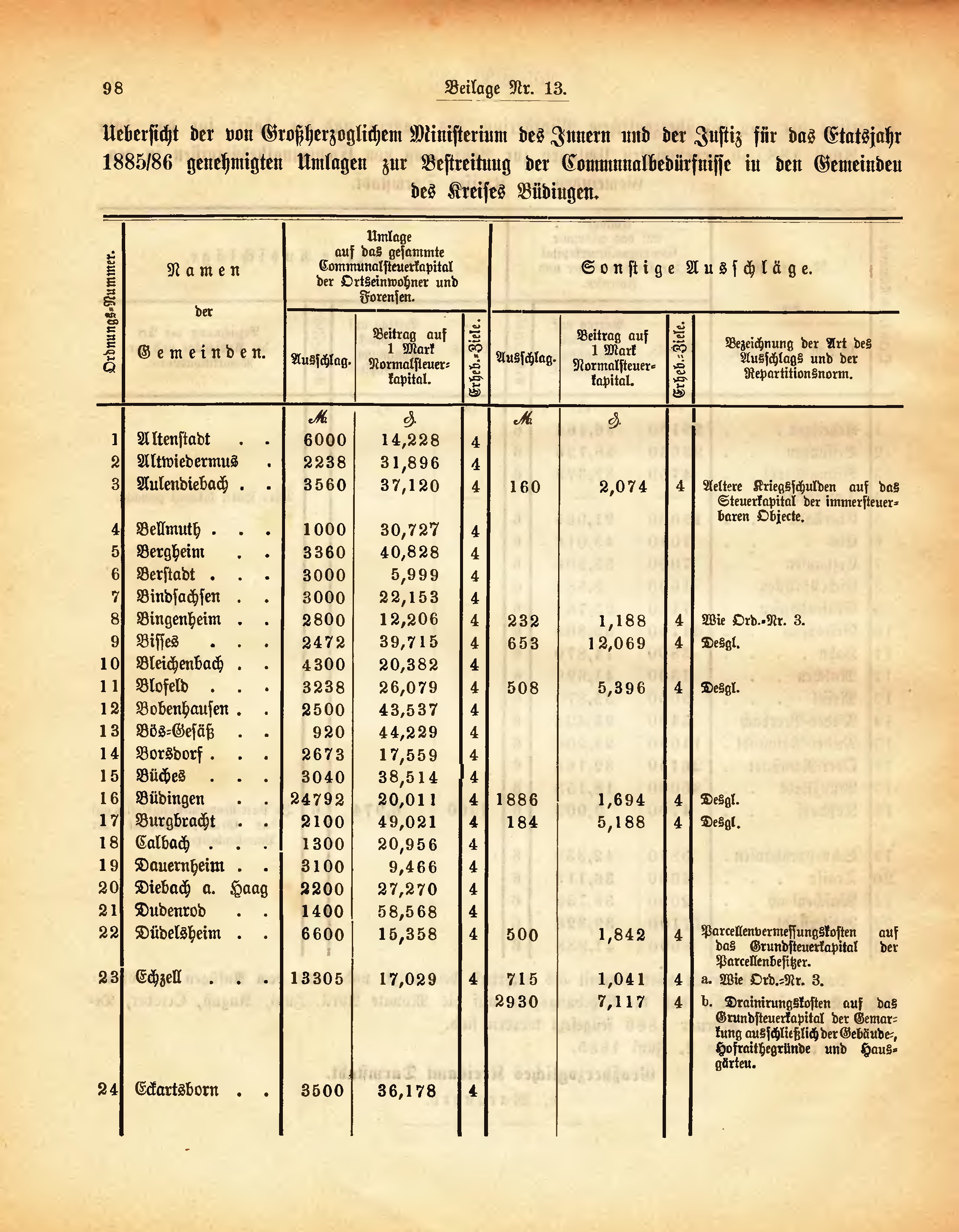 Uebersicht der von Großherzoglichem Ministerium des Innern und der Justiz für das Etatsjahr 1885/86 genehmigten Umlagen zur Bestreitung der Communalbedürfnisse in den Gemeinden des Kreises Büdingen.