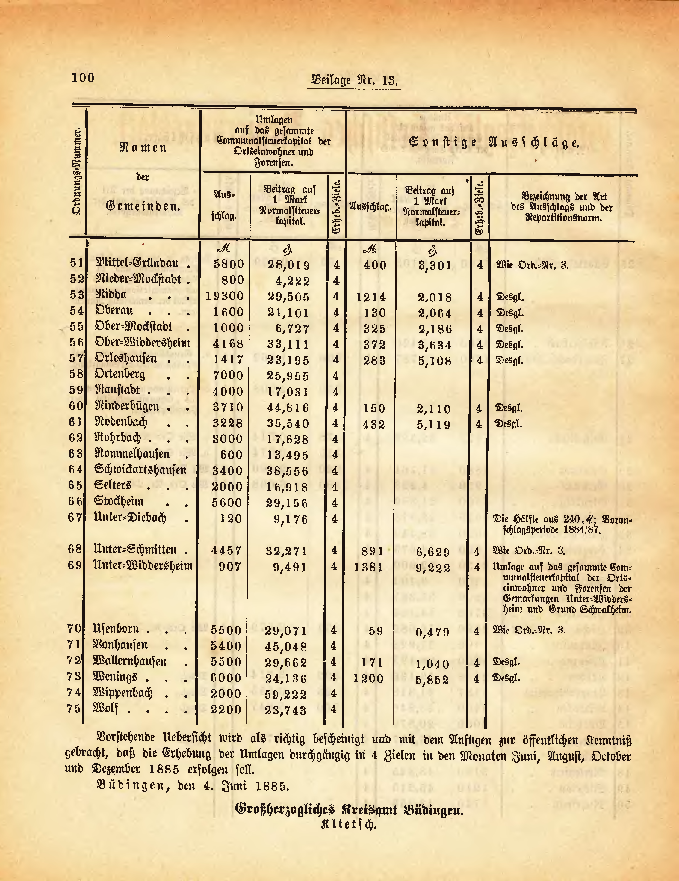 Vorstehende Uebersicht wird als richtig bescheinigt und mit dem Anfügen zur öffentlichen Kenntniß gebracht, daß die Erhebung der Umlagen durchgängig in 4 Zielen in den Monaten Juni, August, October und Dezember 1885 erfolgen soll.