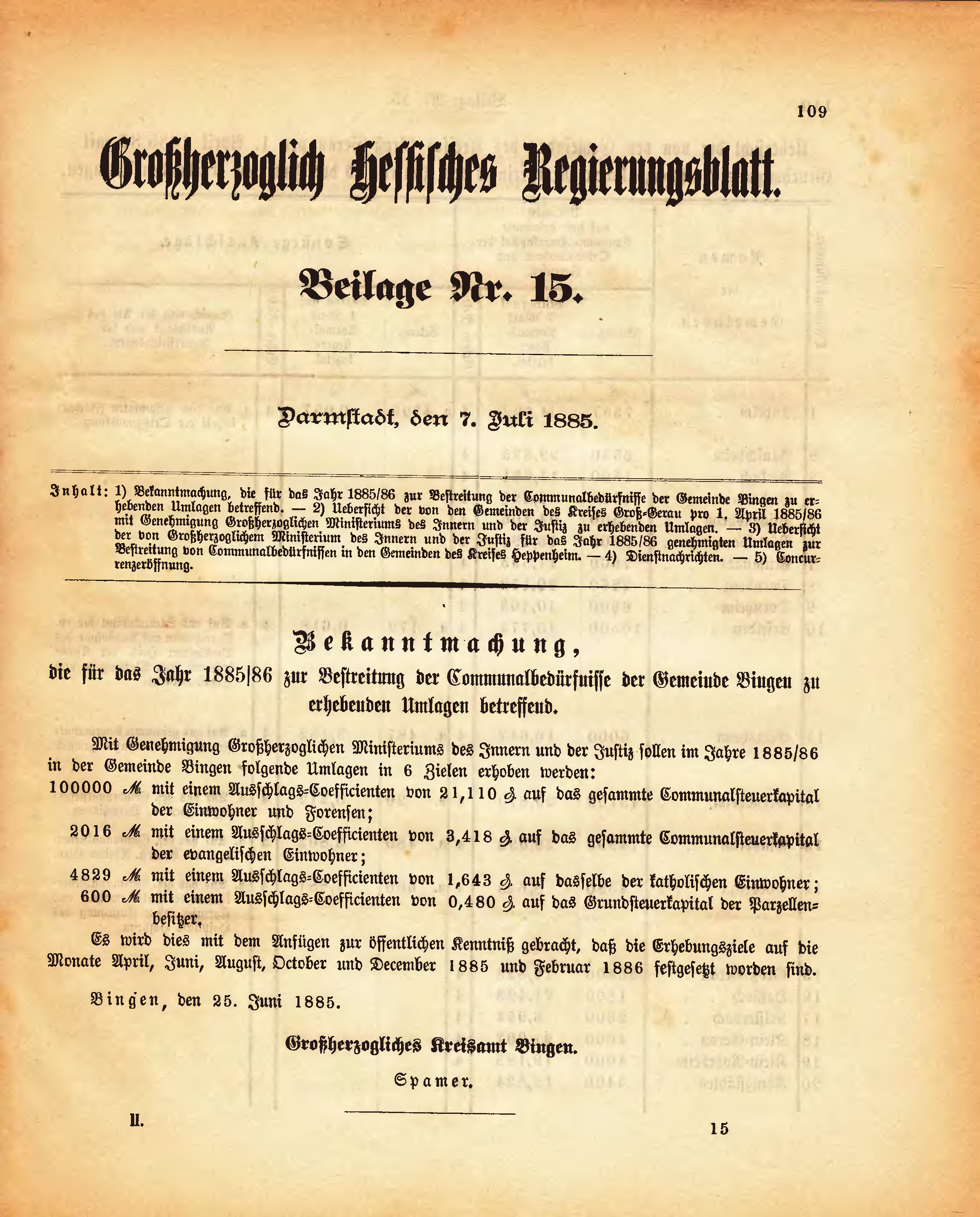 Mit Genehmigung Großherzoglichen Ministeriums des Innern und der Justiz sollen im Jahre 1885/86 in der Gemeinde Bingen folgende Umlagen in 6 Zielen erhoben werden: