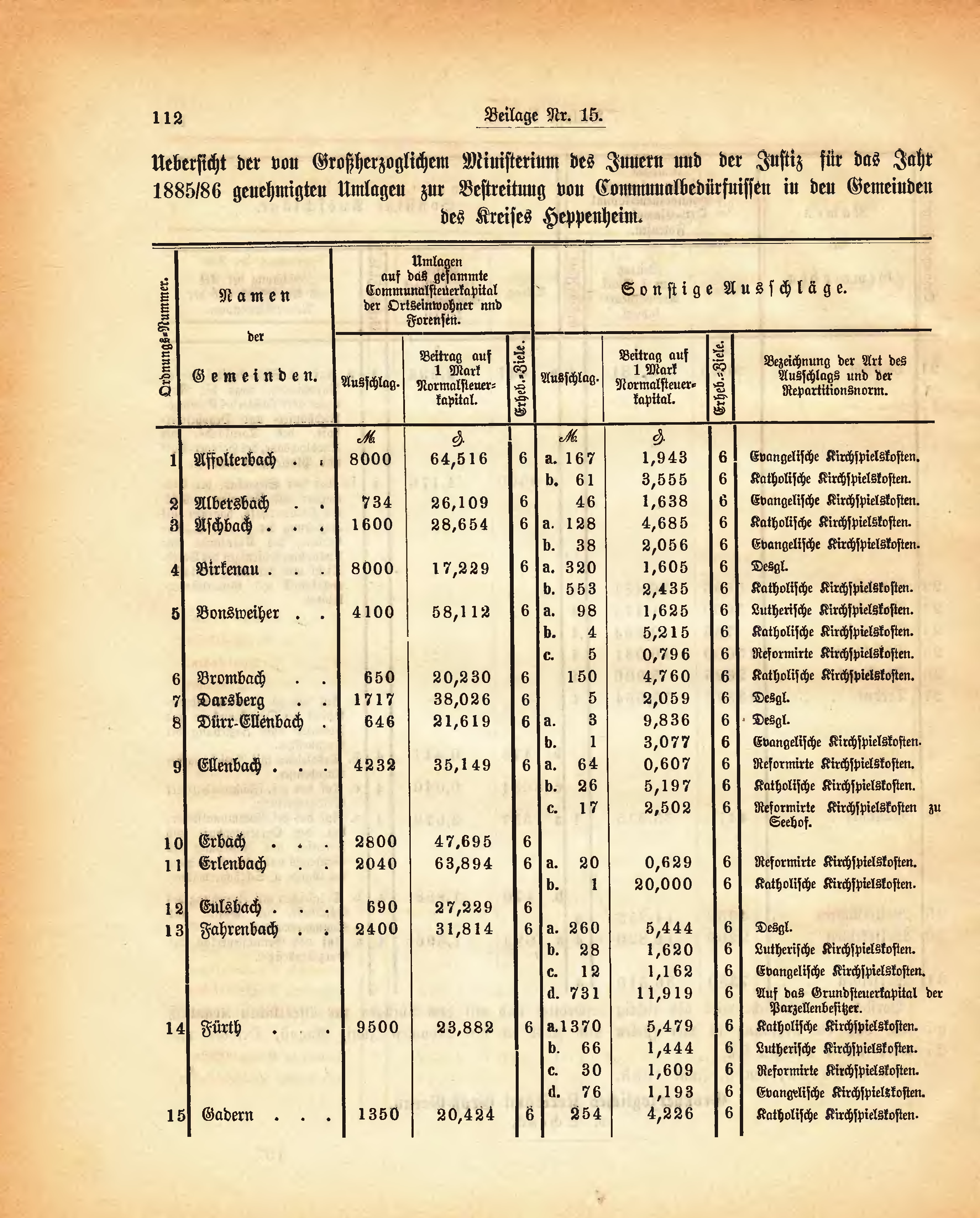Uebersicht der von Großherzoglichem Ministerium des Innern und der Justiz für das Jahr 1885/86 genehmigten Umlagen zur Bestreitung von Communalbedürfnissen in den Gemeinden des Kreises Heppenheim.