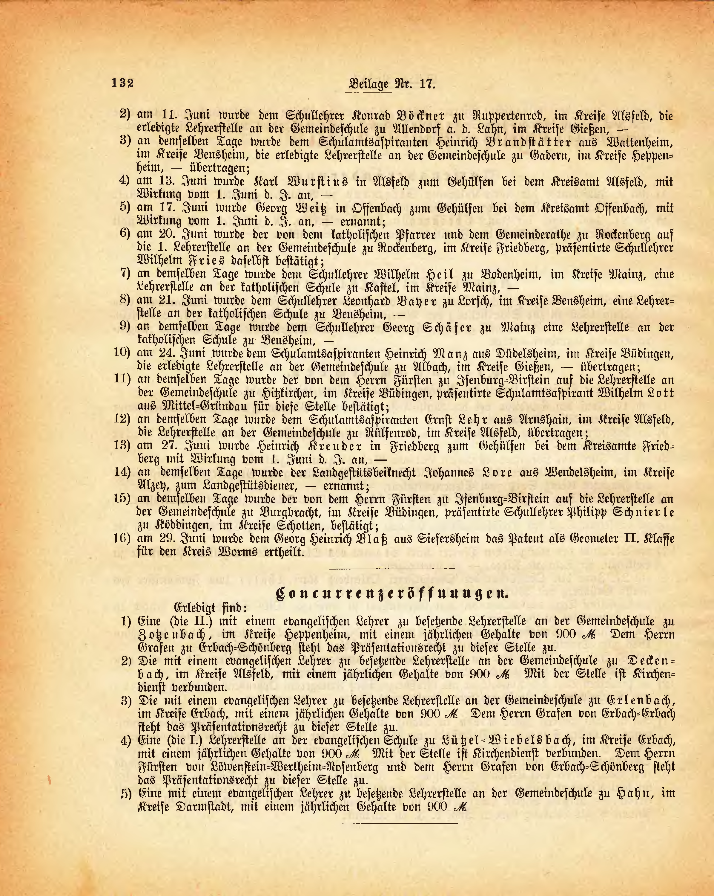 | 10) | am 24. Juni wurde dem Schulamtsaspiranten Heinrich Manz aus Düdelsheim, im Kreise Büdingen, die erledigte Lehrerstelle an der Gemeindeschule zu Albach, im Kreise Gießen, - übertragen; |