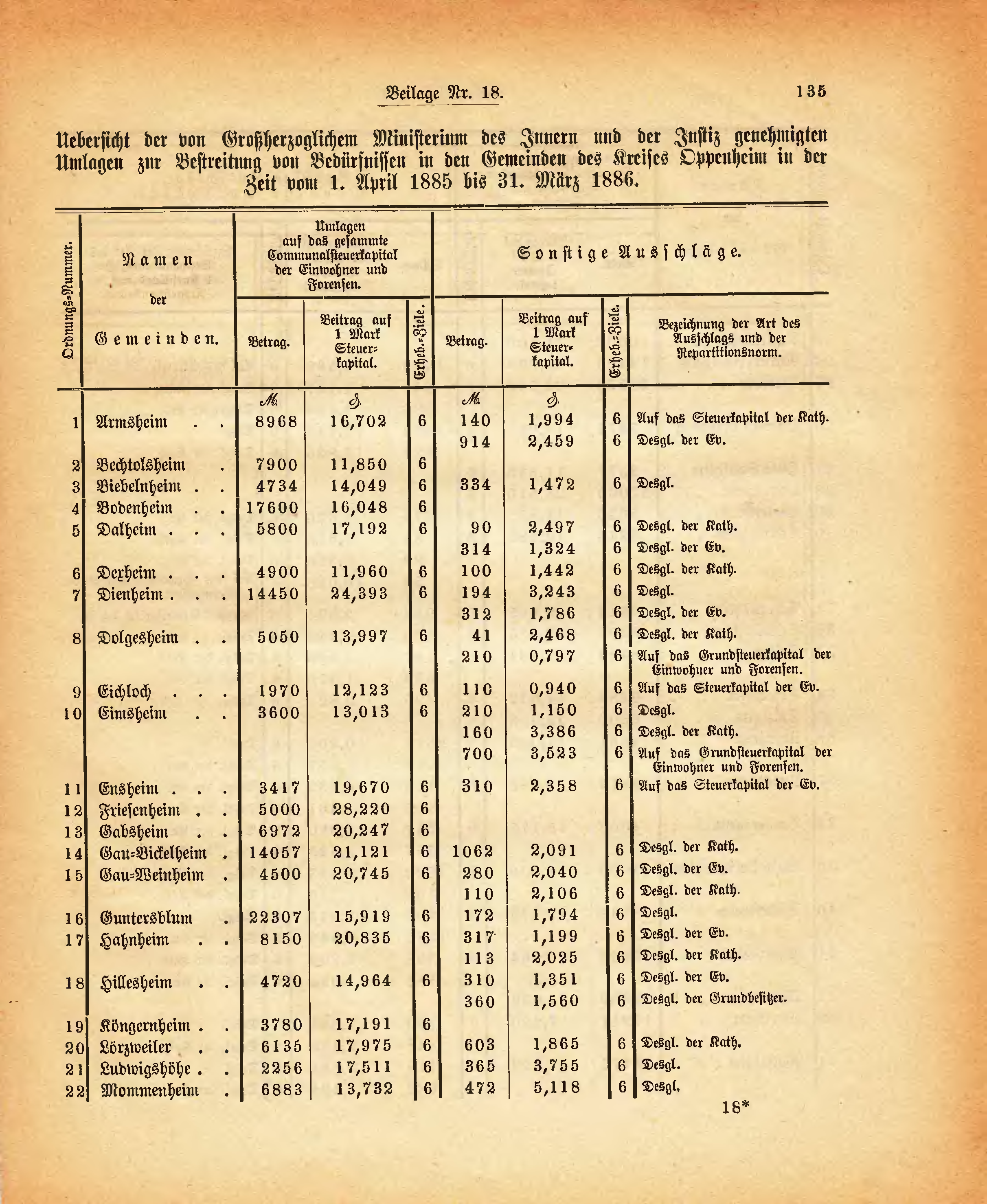 Uebersicht der von Großherzoglichem Ministerium des Innern und der Justiz genehmigten Umlagen zur Bestreitung von Bedürfnissen in den Gemeinden des Kreises Oppenheim in der Zeit vom 1. April 1885 bis 31. März 1886.
