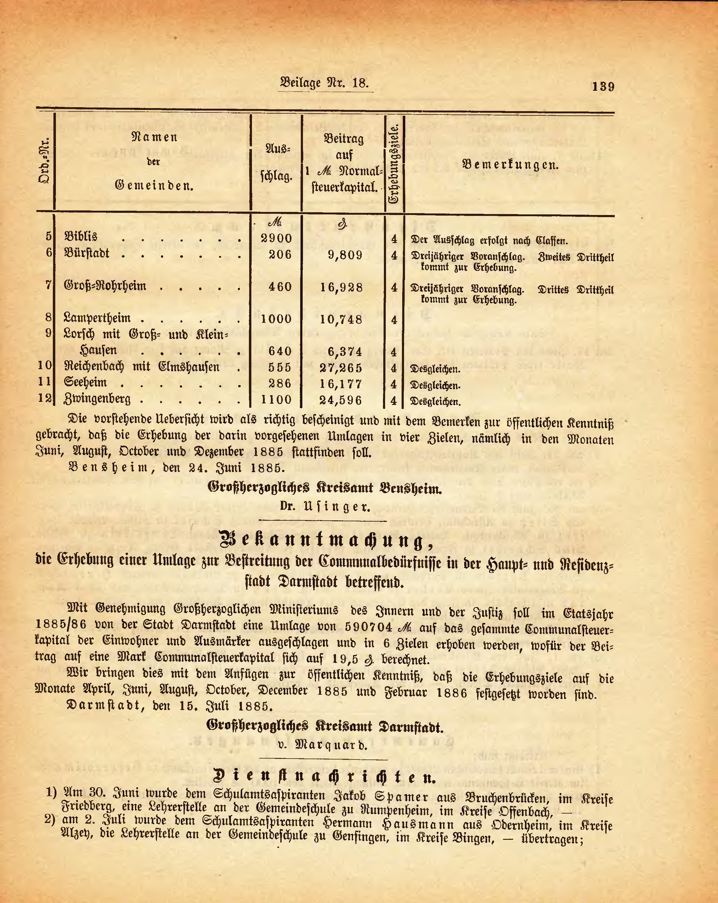 Mit Genehmigung Großherzoglichen Ministeriums des Innern und der Justiz soll im Etatsjahr 1885/86 von der Stadt Darmstadt eine Umlage von 590704