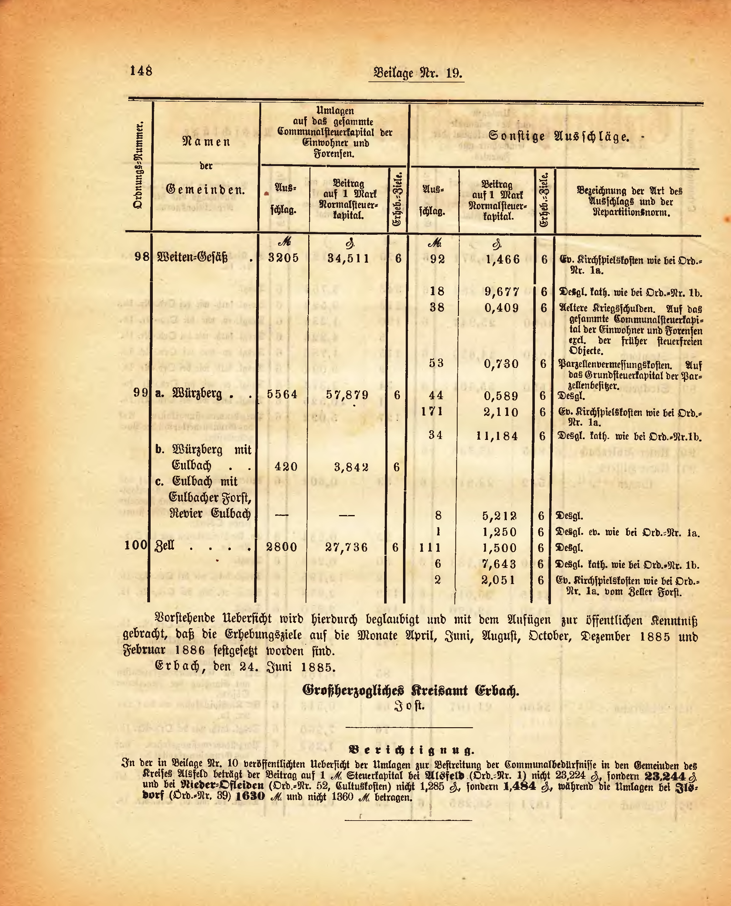 Vorstehende Uebersicht wird hierdurch beglaubigt und mit dem Anfügen zur öffentlichen Kenntniß gebracht, daß die Erhebungsziele auf die Monate April, Juni, August, October, Dezember 1885 und Februar 1886 festgesetzt worden sind.