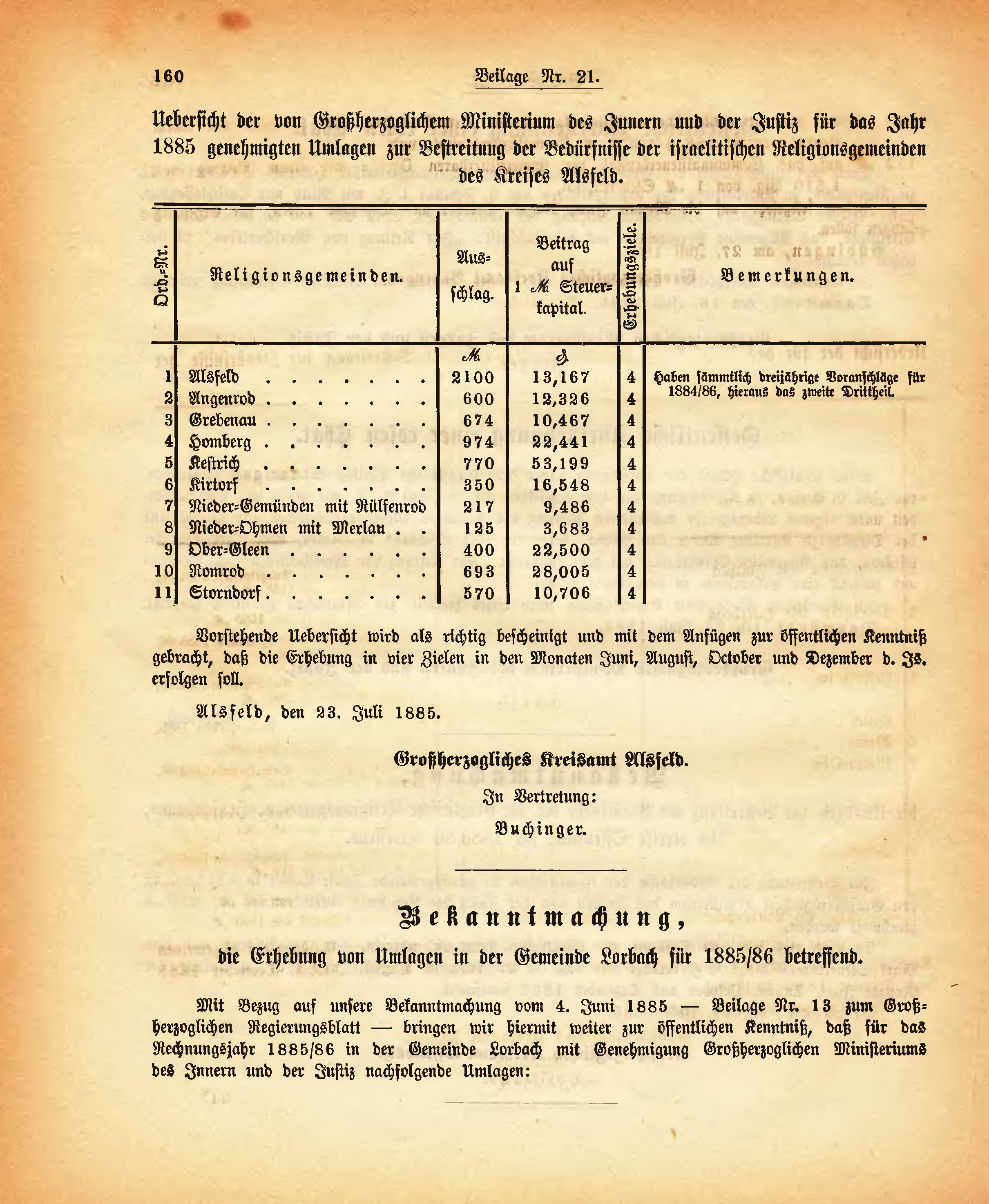 Uebersicht der von Großherzoglichem Ministerium des Innern und der Justiz für das Jahr 1885 genehmigten Umlagen zur Bestreitung der Bedürfnisse der israelitischen Religionsgemeinden des Kreises Alsfeld.