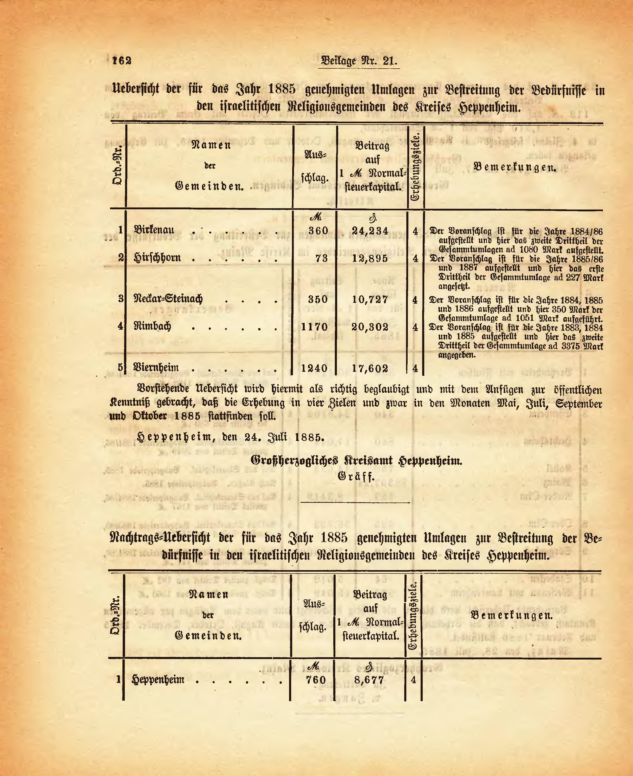 Nachtrags-Uebersicht der für das Jahr 1885 genehmigten Umlagen zur Bestreitung der Bedürfnisse in den israelitischen Religionsgemeinden des Kreises Heppenheim.