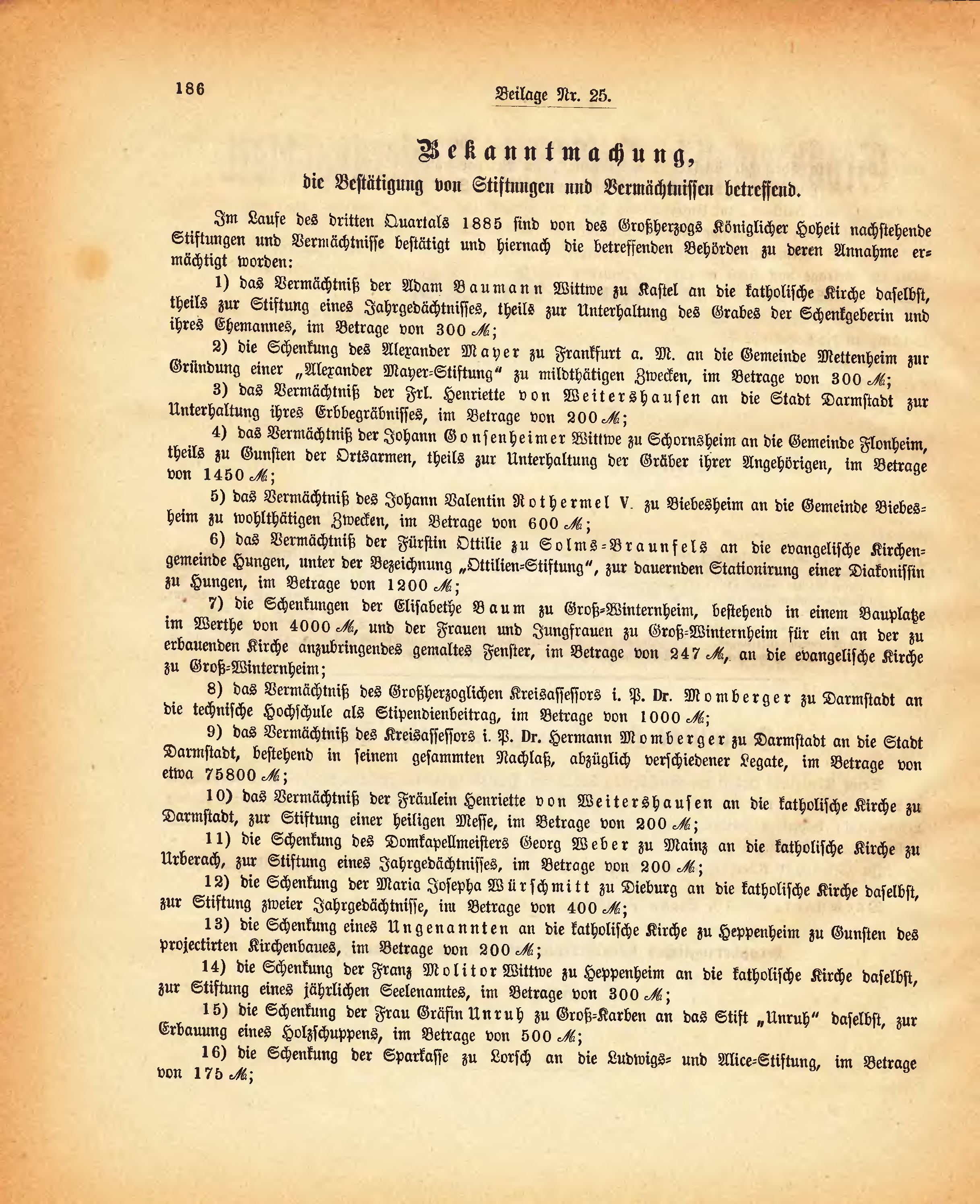 Im Laufe des dritten Quartals 1885 sind von des Großherzogs Königlicher Hoheit nachstehende Stiftungen und Vermächtnisse bestätigt und hiernach die betreffenden Behörden zu deren Annahme ermächtigt worden: