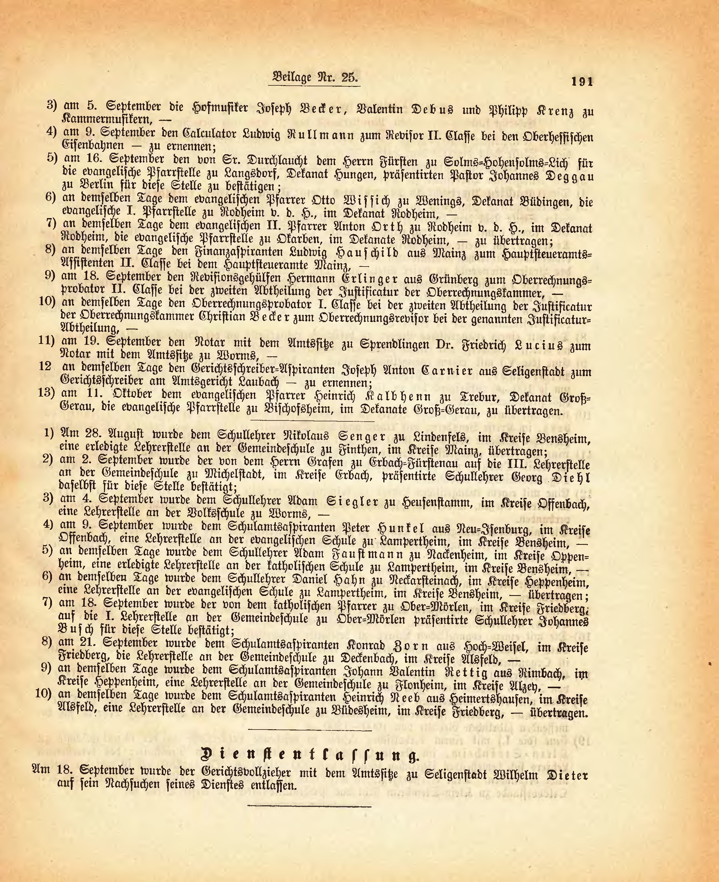 | 3) | am 4. September wurde dem Schullehrer Adam Siegler zu Heusenstamm, im Kreise Offenbach, eine Lehrerstelle an der Volksschule zu Worms, - |