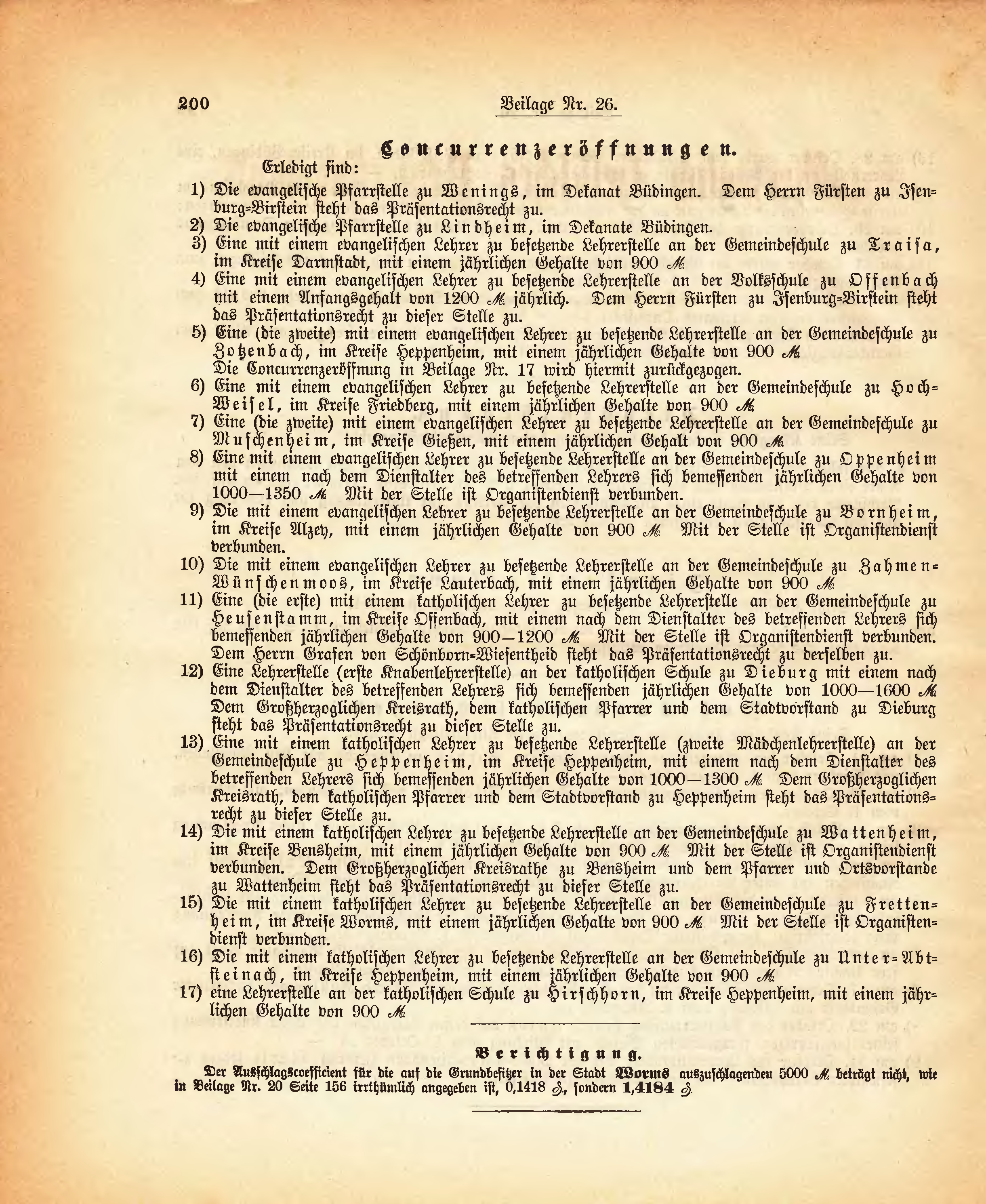 Eine mit einem katholischen Lehrer zu besetzende Lehrerstelle (zweite Mädchenlehrerstelle) an der Gemeindeschule zu Heppenheim, im Kreise Heppenheim, mit einem nach dem Dienstalter des betreffenden Lehrers sich bemessenden jährlichen Gehalte von 1000-1300 Dem Großherzoglichen Kreisrath, dem katholischen Pfarrer und dem Stadtvorstand zu Heppenheim steht das Präsentationsrecht zu dieser Stelle zu.