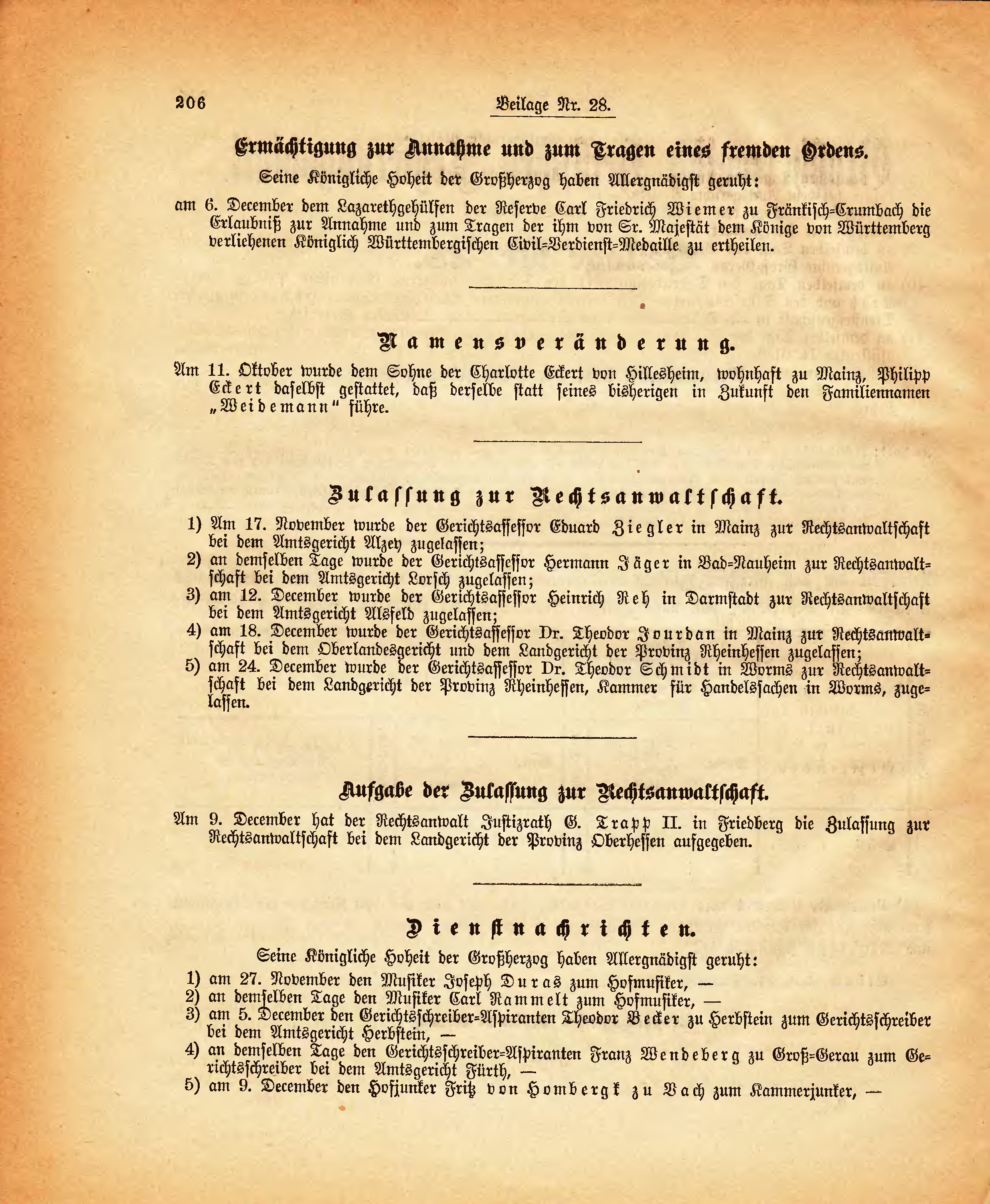 | Mainz, Philipp Eckert daselbst gestattet, daß derselbe statt seines bisherigen in Zukunft den Familiennamen "Weidemann" führe. | |