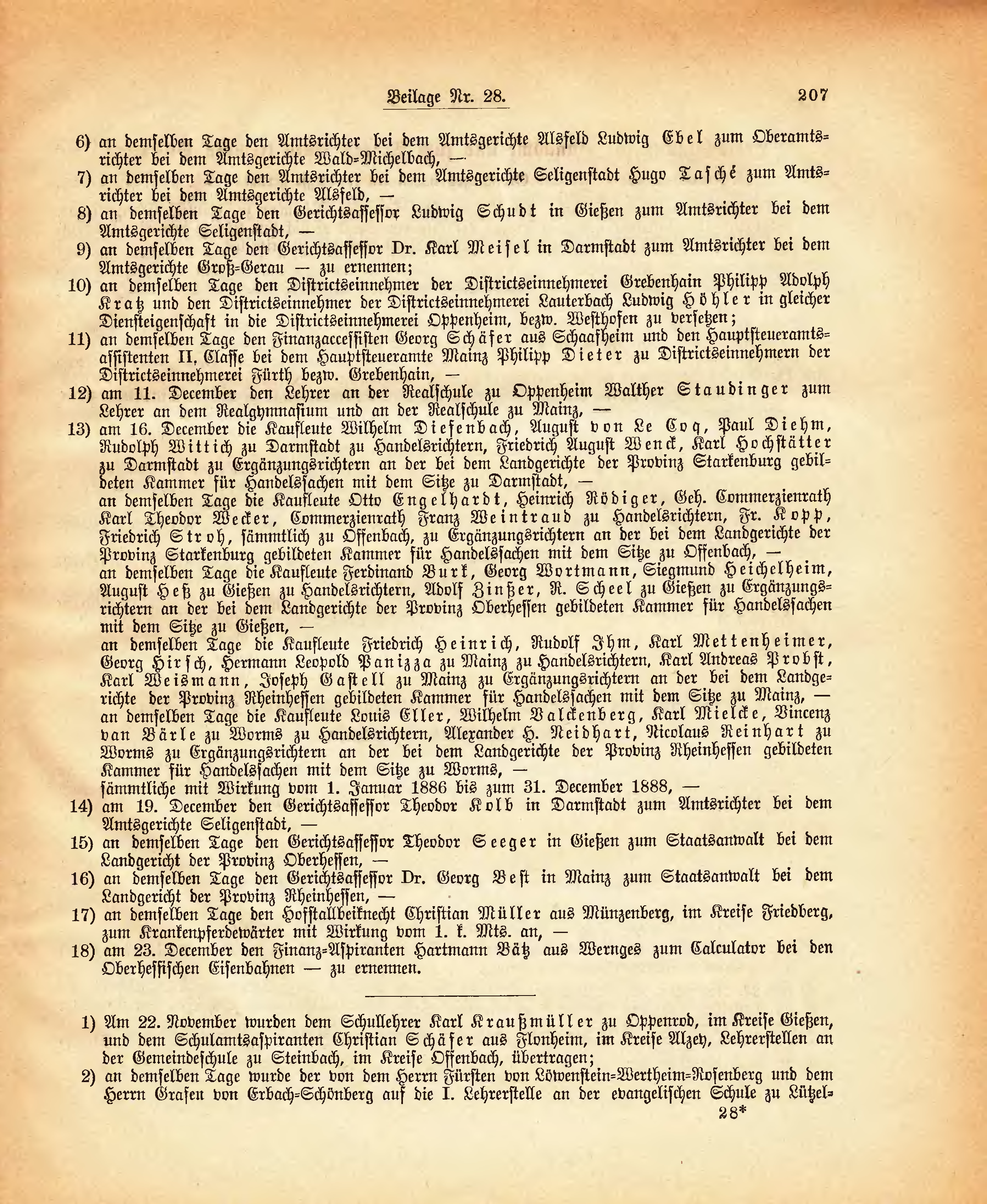 | an demselben Tage die Kaufleute Otto Engelhardt, Heinrich Rödiger, Geh. Commerzienrath Karl Theodor Wecker, Commerzienrath Franz Weintraud zu Handelsrichtern, Fr. Kopp, Friedrich Stroh, sämmtlich zu Offenbach, zu Ergänzungsrichtern an der bei dem Landgerichte der Provinz Starkenburg gebildeten Kammer für Handelssachen mit dem Sitze zu Offenbach, - an demselben Tage die Kaufleute Ferdinand Burk, Georg Wortmann, Siegmund Heichelheim, August Heß zu Gießen zu Handelsrichtern, Adolf Zinßer, R. Scheel zu Gießen zu Ergänzungsrichtern an der bei dem Landgerichte der Provinz Oberhessen gebildeten Kammer für Handelssachen mit dem Sitze zu Gießen, - an demselben Tage die Kaufleute Friedrich Heinrich, Rudolf Ihm, Karl Mettenheimer, Georg Hirsch, Hermann Leopold Panizza zu Mainz zu Handelsrichtern, Karl Andreas Probst, Karl Weismann, Joseph Gastell zu Mainz zu Ergänzungsrichtern an der bei dem Landgerichte der Provinz Rheinhessen gebildeten Kammer für Handelssachen mit dem Sitze zu Mainz, - an demselben Tage die Kaufleute Louis Eller, Wilhelm Valckenberg, Karl Mielcke, Vincenz van Bärle zu Worms zu Handelsrichtern, Alexander H. Neidhart, Nicolaus Reinhart zu Worms zu Ergänzungsrichtern an der bei dem Landgerichte der Provinz Rheinhessen gebildeten Kammer für Handelssachen mit dem Sitze zu Worms, - sämmtliche mit Wirkung vom 1. Januar 1886 bis zum 31. December 1888, - | |