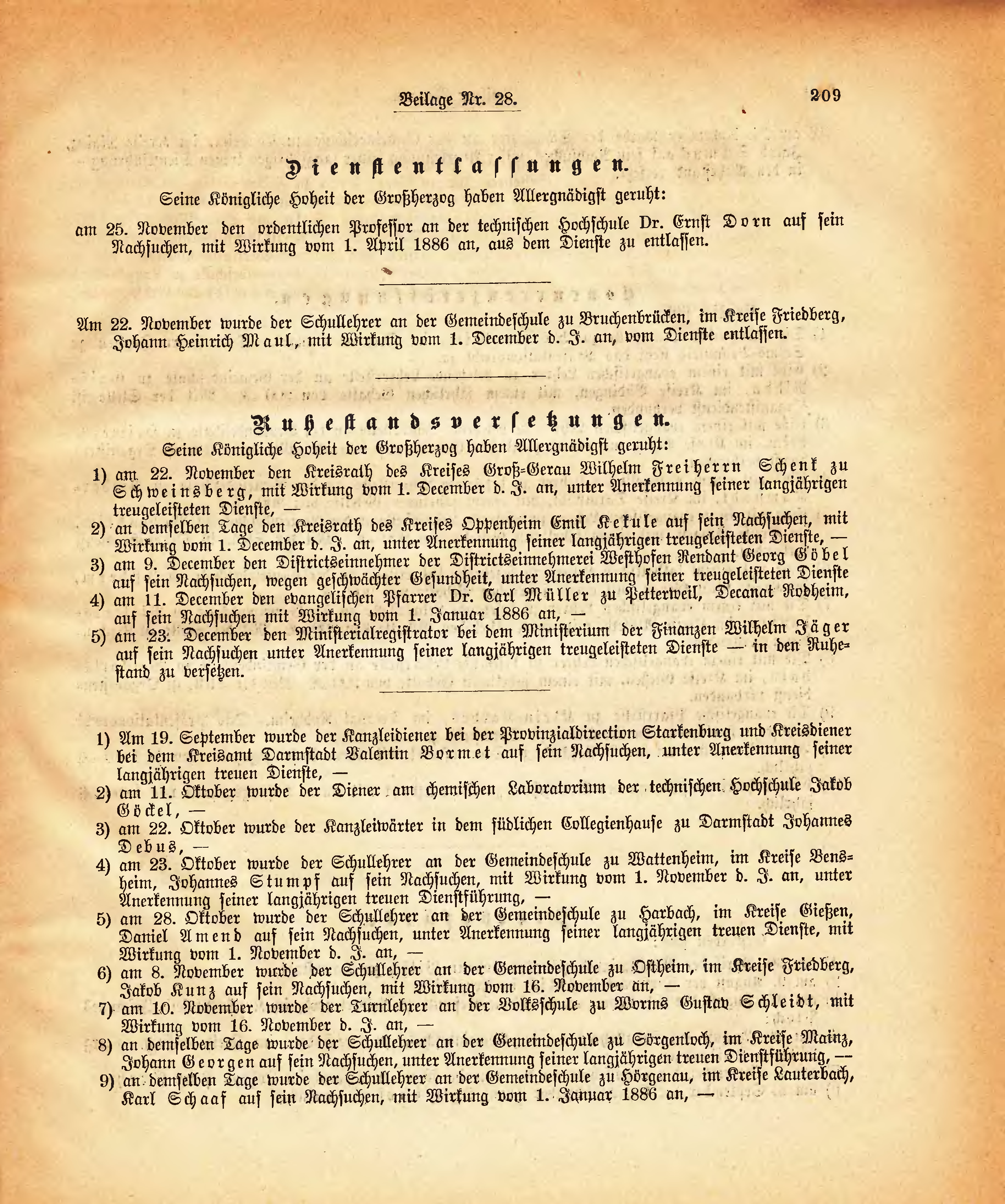 | 9) | an demselben Tage wurde der Schullehrer an der Gemeindeschule zu Hörgenau, im Kreise Lauterbach, Karl Schaaf auf sein Nachsuchen, mit Wirkung vom 1. Januar 1886 an, - |