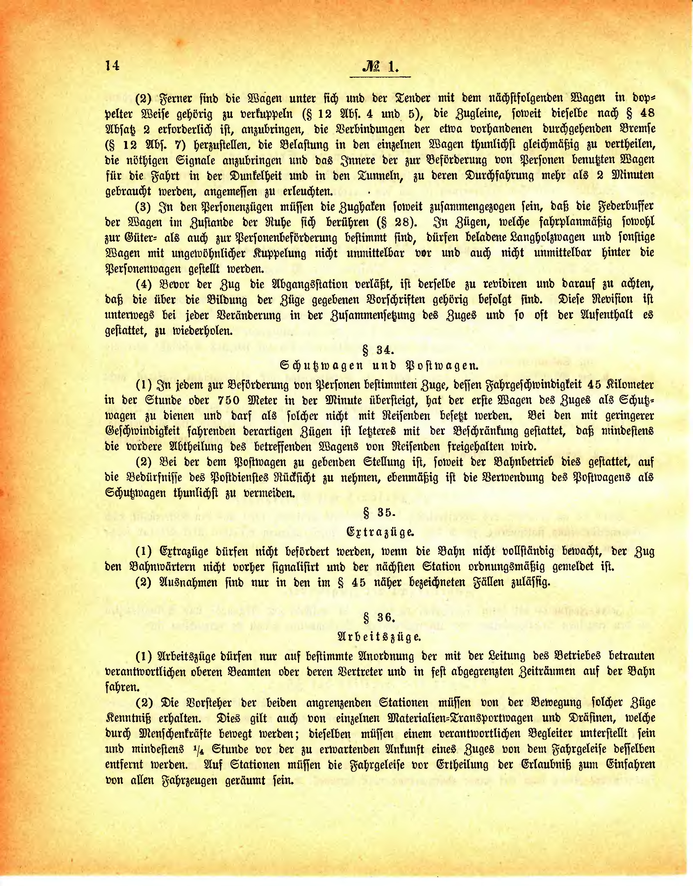 (1) In jedem zur Beförderung von Personen bestimmten Zuge, dessen Fahrgeschwindigkeit 45 Kilometer in der Stunde oder 750 Meter in der Minute übersteigt, hat der erste Wagen des Zuges als Schutzwagen zu dienen und darf als solcher nicht mit Reisenden besetzt werden. Bei den mit geringerer Geschwindigkeit fahrenden derartigen Zügen ist letzteres mit der Beschränkung gestattet, daß mindestens die vordere Abtheilung des betreffenden Wagens von Reisenden freigehalten wird.