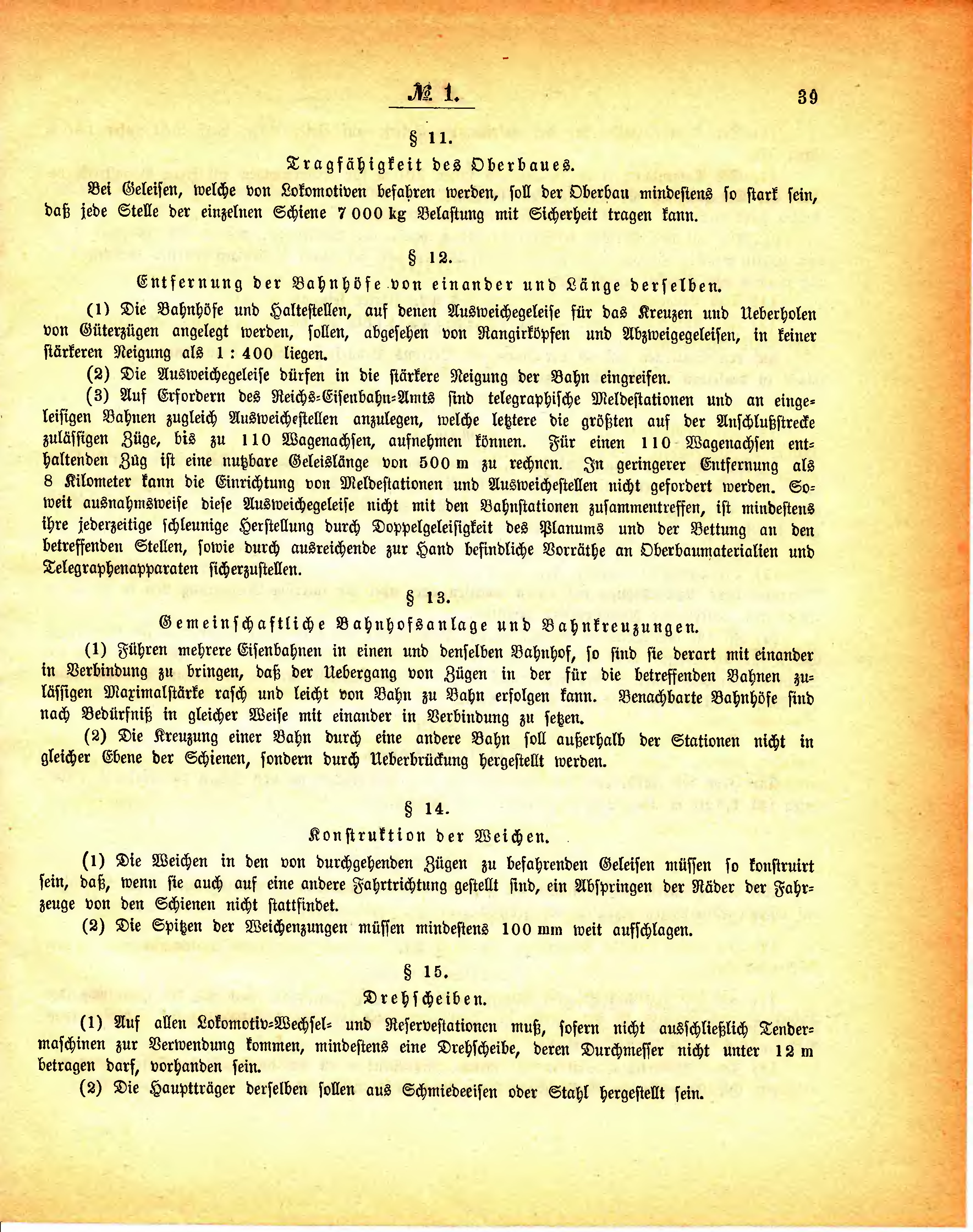 (1) Die Weichen in den von durchgehenden Zügen zu befahrenden Geleisen müssen so konstruirt sein, daß, wenn sie auch auf eine andere Fahrtrichtung gestellt sind, ein Abspringen der Räder der Fahrzeuge von den Schienen nicht stattfindet.