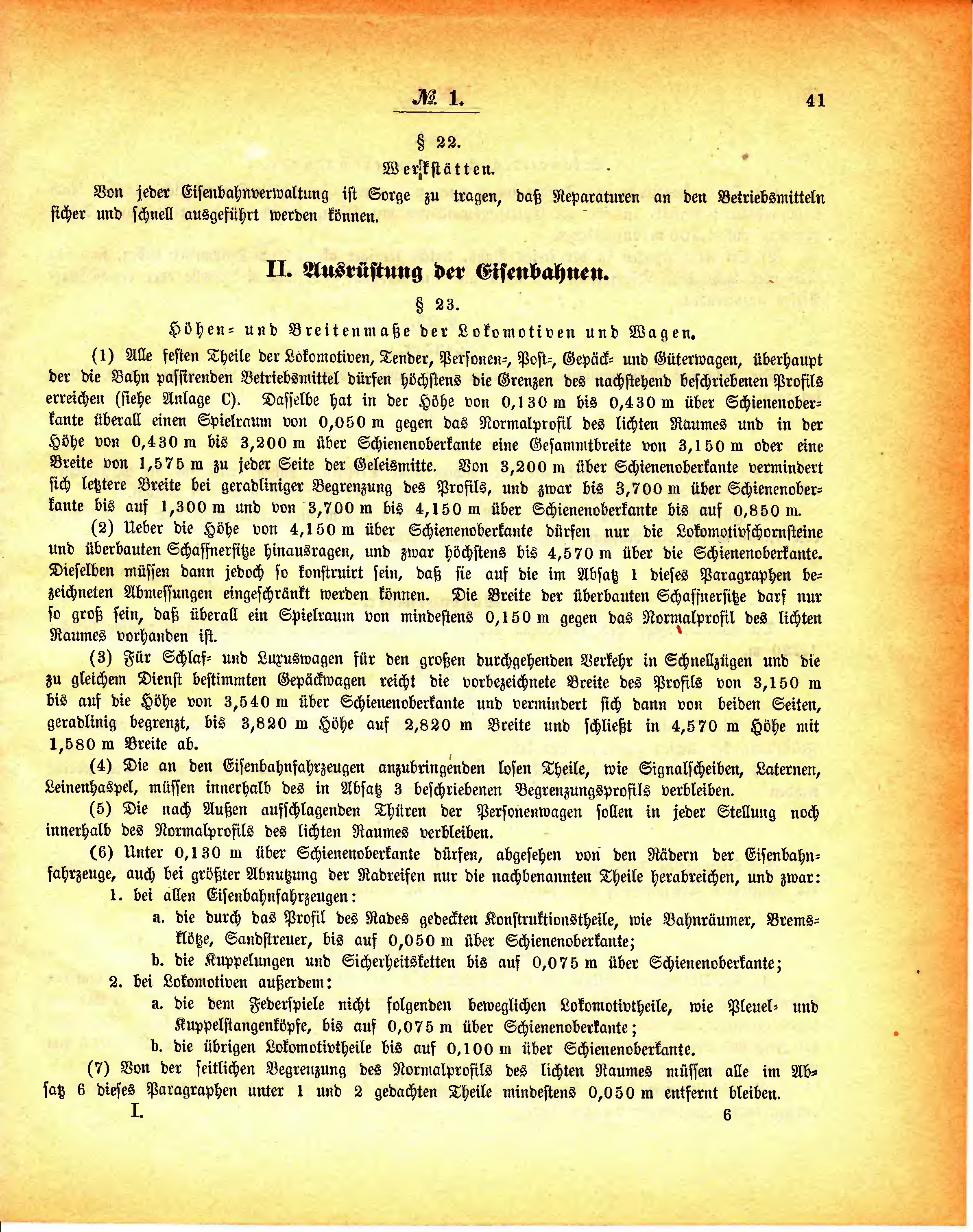 (1) Alle festen Theile der Lokomotiven, Tender, Personen-, Post-, Gepäck- und Güterwagen, überhaupt der die Bahn passirenden Betriebsmittel dürfen höchstens die Grenzen des nachstehend beschriebenen Profils erreichen (siehe Anlage C). Dasselbe hat in der Höhe von 0,130 m bis 0,430 m über Schienenoberkante überall einen Spielraum von 0,050 m gegen das Normalprofil des lichten Raumes und in der Höhe von 0,430 m bis 3,200 m über Schienenoberkante eine Gesammtbreite von 3,150 m oder eine Breite von 1,575 m zu jeder Seite der Geleismitte. Von 3,200 m über Schienenoberkante vermindert sich letztere Breite bei geradliniger Begrenzung des Profils, und zwar bis 3,700 m über Schienenoberkante bis auf 1,300 m und von 3,700 m bis 4,150 m über Schienenoberkante bis auf 0,850 m.