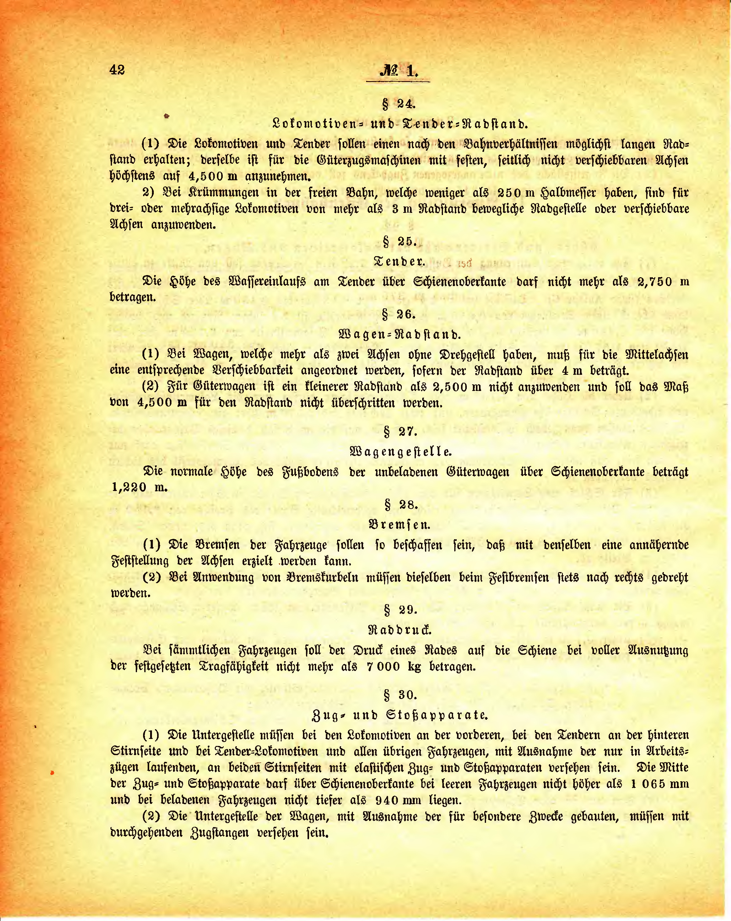 (1) Die Lokomotiven und Tender sollen einen nach den Bahnverhältnissen möglichst langen Radstand erhalten; derselbe ist für die Güterzugsmaschinen mit festen, seitlich nicht verschiebbaren Achsen höchstens auf 4,500 m anzunehmen.