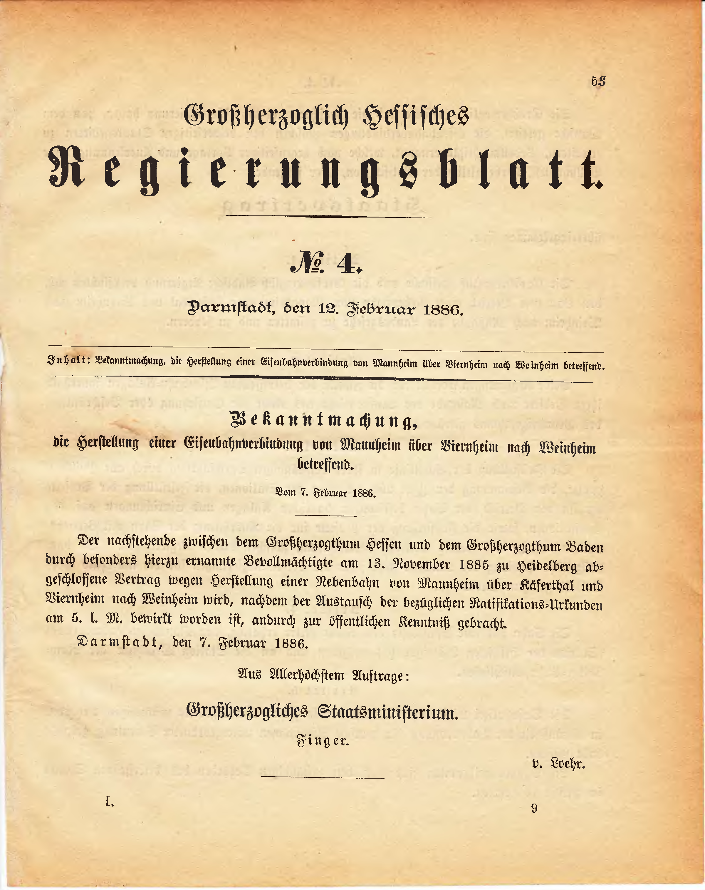 Inhalt: Bekanntmachung, die Herstellung einer Eisenbahnverbindung von Mannheim über Viernheim nach Weinheim betreffend.