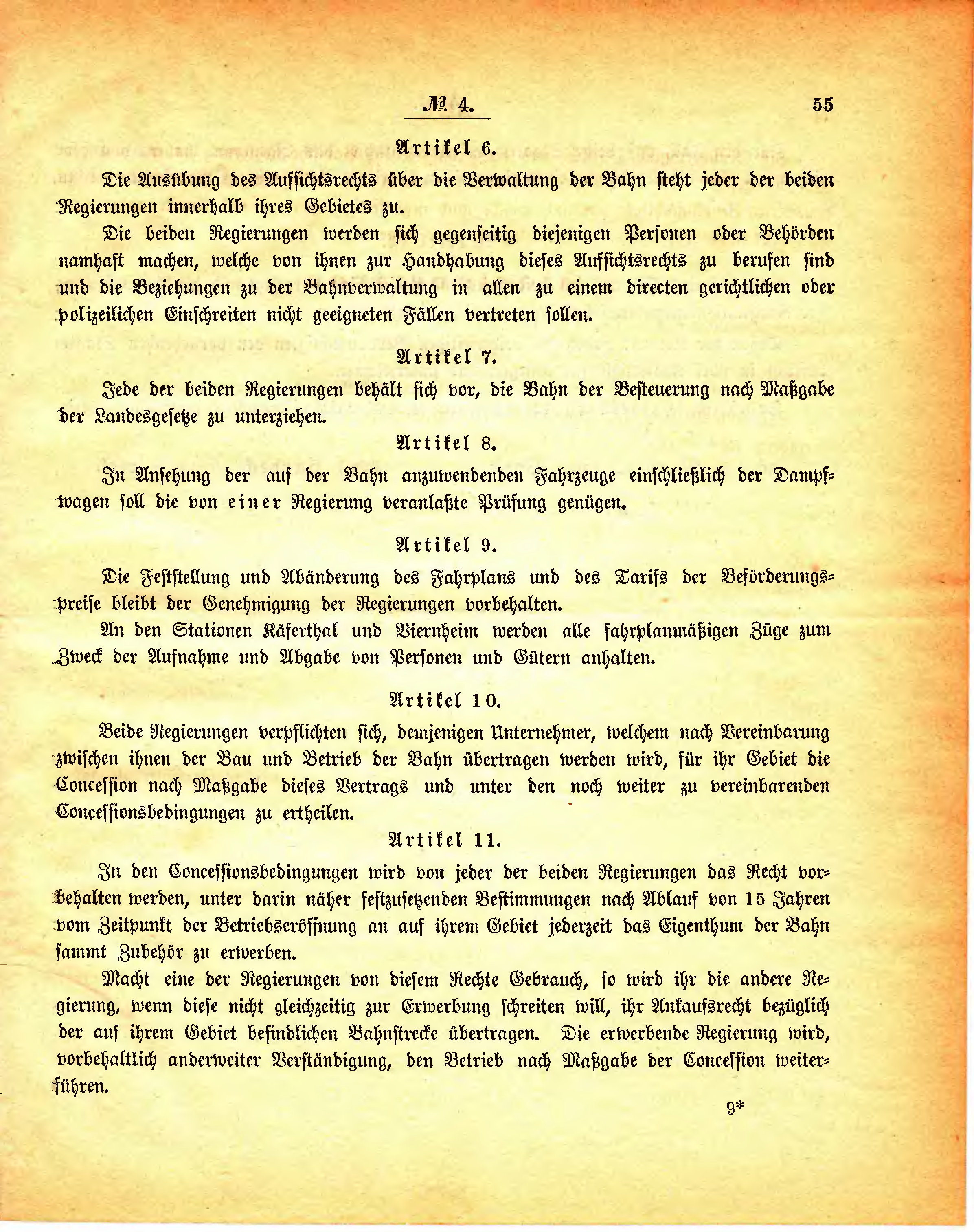 In den Concessionsbedingungen wird von jeder der beiden Regierungen das Recht vorbehalten werden, unter darin näher festzusetzenden Bestimmungen nach Ablauf von 15 Jahren vom Zeitpunkt der Betriebseröffnung an auf ihrem Gebiet jederzeit das Eigenthum der Bahn sammt Zubehör zu erwerben.