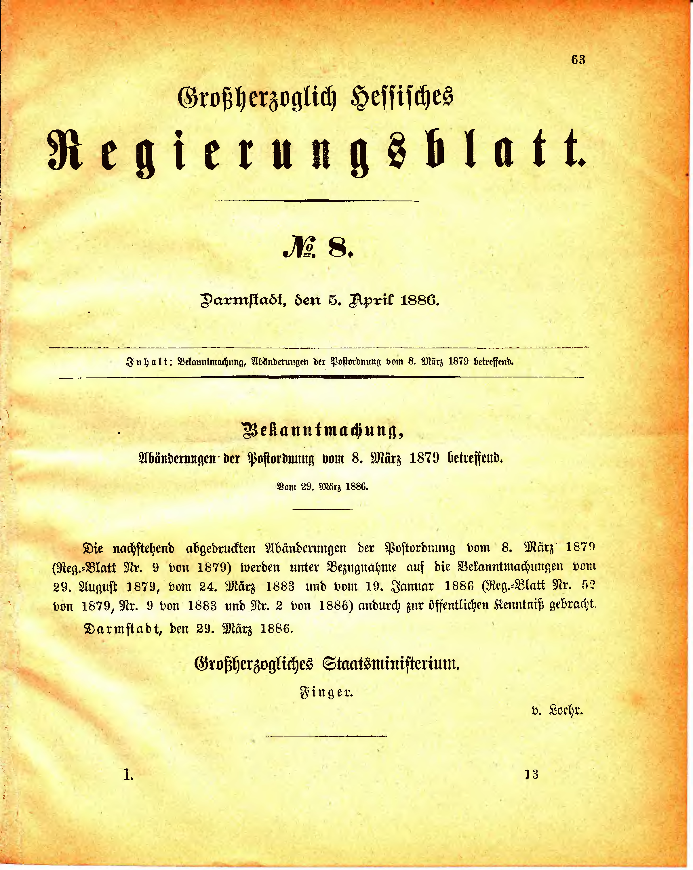 Die nachstehend abgedruckten Abänderungen der Postordnung vom 8. März 1879 (Reg.-Blatt Nr. 9 von 1879) werden unter Bezugnahme auf die Bekanntmachungen vom 29. August 1879, vom 24. März 1883 und vom 19. Januar 1886 (Reg.-Blatt Nr. 52 von 1879, Nr. 9 von 1883 und Nr. 2 von 1886) andurch zur öffentlichen Kenntniß gebracht.