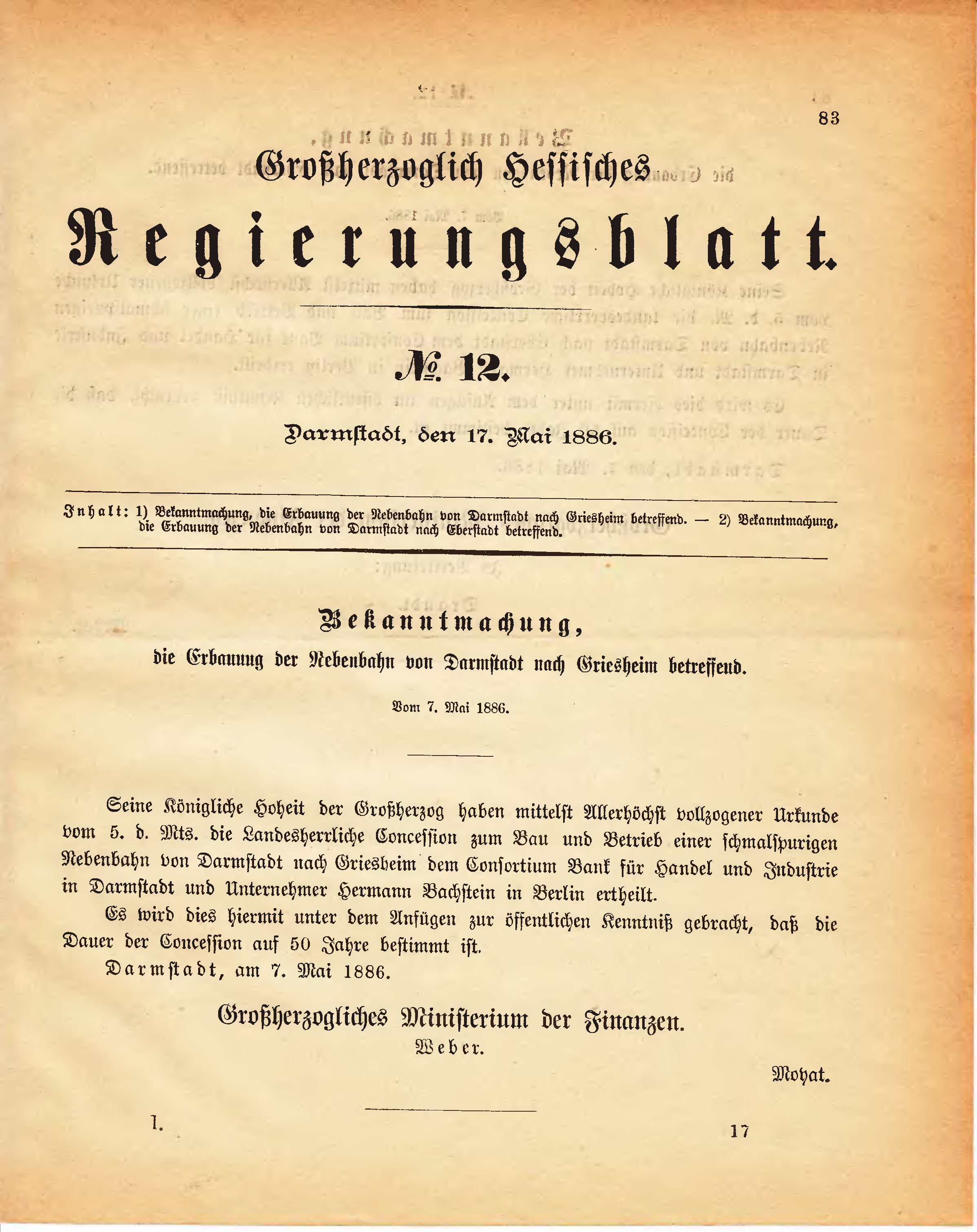Seine Königliche Hoheit der Großherzog haben mittelst Allerhöchst vollzogener Urkunde vom 5. d. Mts. die Landesherrliche Concession zum Bau und Betrieb einer schmalspurigen Nebenbahn von Darmstadt nach Griesheim dem Consortium Bank für Handel und Industrie in Darmstadt und Unternehmer Hermann Bachstein in Berlin ertheilt.