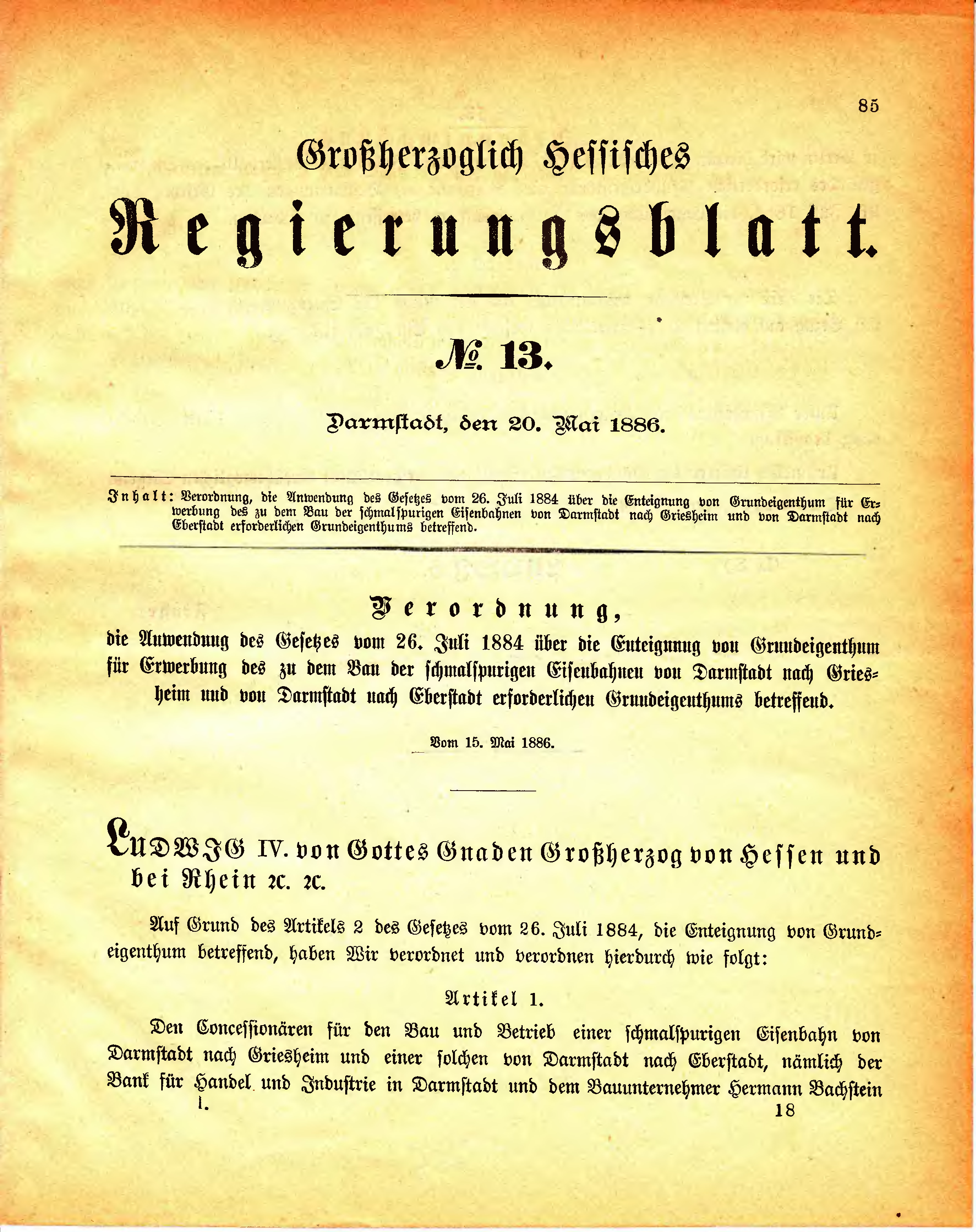 die Anwendung des Gesetzes vom 26. Juli 1884 über die Enteignung von Grundeigenthum für Erwerbung des zu dem Ban der schmalspurigen Eisenbahnen von Darmstadt nach Griesheim und von Darmstadt nach Eberstadt erforderlichen Grundeigenthums betreffend.