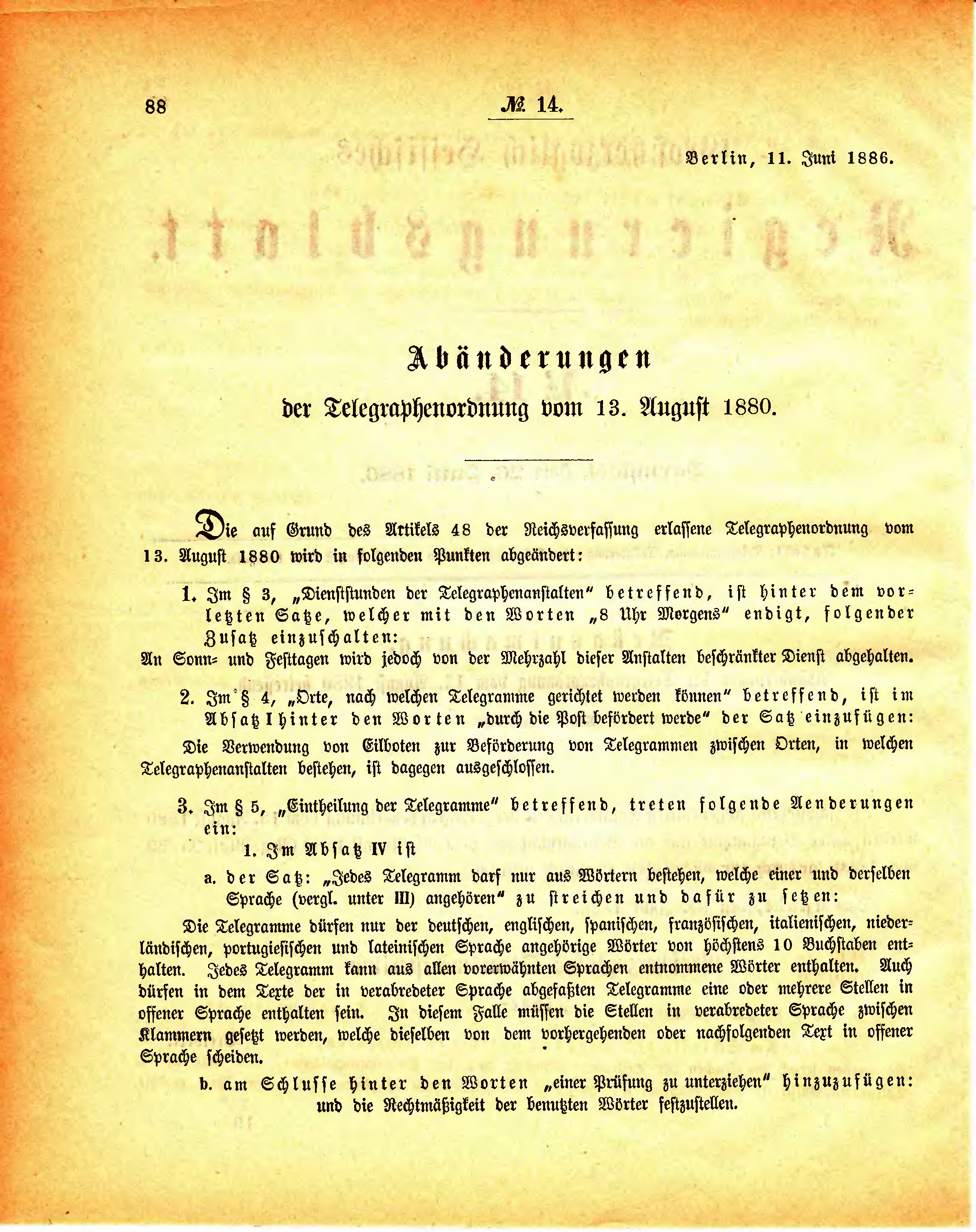 Die auf Grund des Artikels 48 der Reichsverfassung erlassene Telegraphenordnung vom 13. August 1880 wird in folgenden Punkten abgeändert: