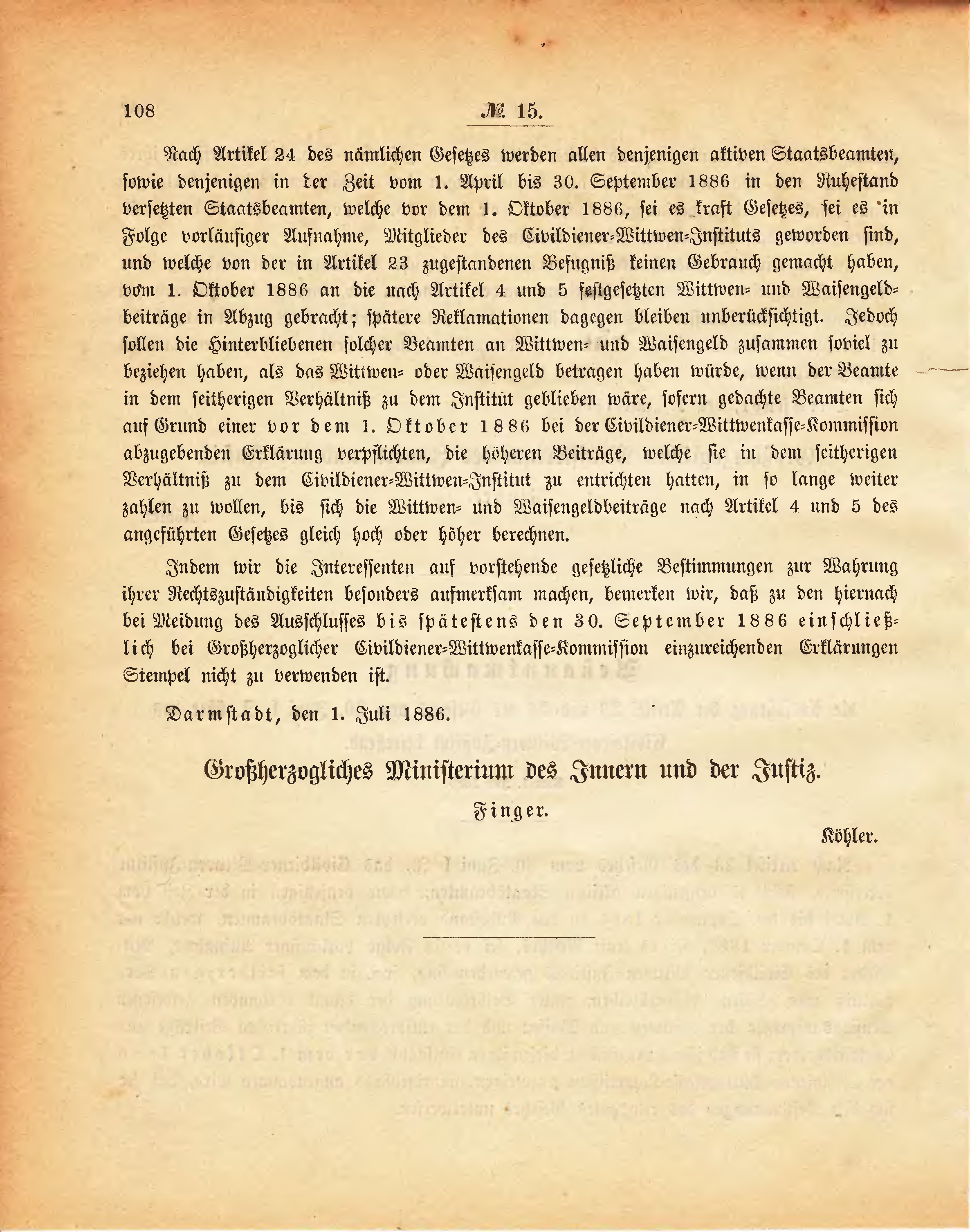 Indem wir die Interessenten auf vorstehende gesetzliche Bestimmungen zur Wahrung ihrer Rechtszuständigkeiten besonders aufmerksam machen, bemerken wir, daß zu den hiernach bei Meidung des Ausschlusses bis spätestens den 30. September 1886 einschließlich bei Großherzoglicher Civildiener-Wittwenkasse-Kommission einzureichenden Erklärungen Stempel nicht zu verwenden ist.