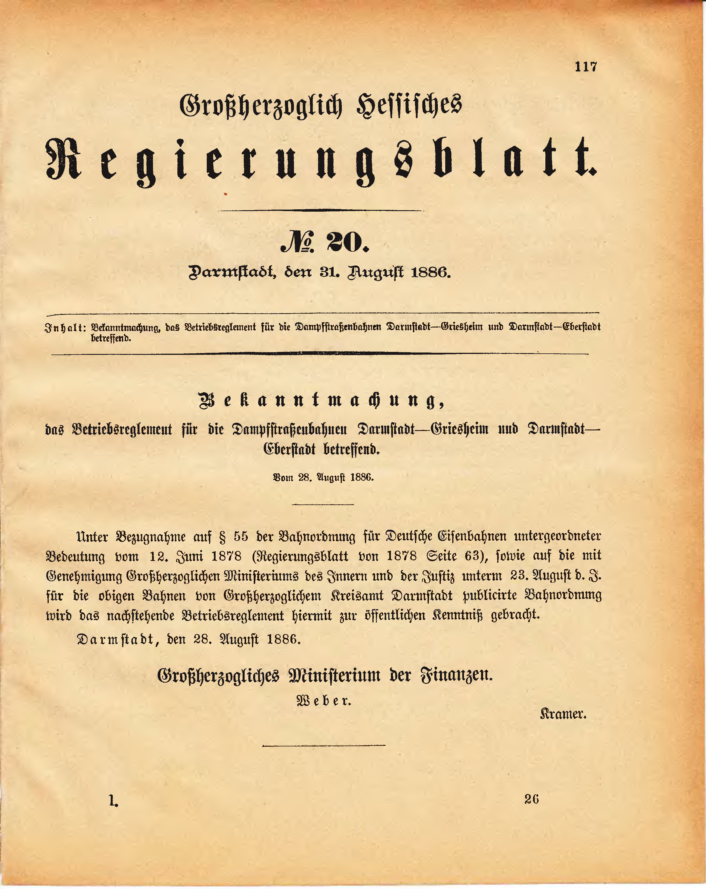| Inhalt: | Bekanntmachung, das Betriebsreglement für die Dampfstraßenbahnen Darmstadt-Griesheim und Darmstadt-Eberstadt betreffend. |