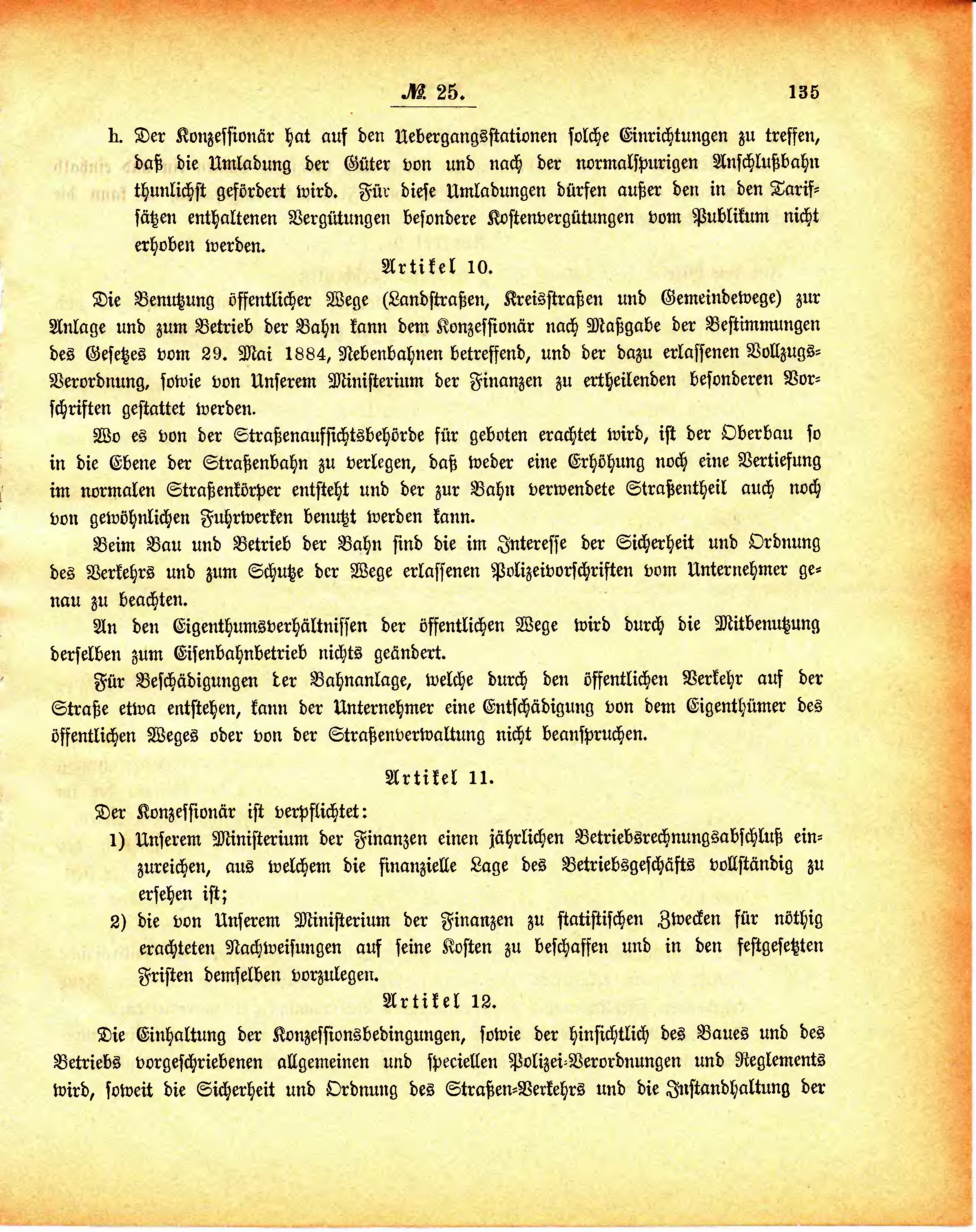 Die Benutzung öffentlicher Wege (Landstraßen, Kreisstraßen und Gemeindewege) zur Anlage und zum Betrieb der Bahn kann dem Konzessionär nach Maßgabe der Bestimmungen des Gesetzes vom 29. Mai 1884, Nebenbahnen betreffend, und der dazu erlassenen Vollzugs-Verordnung, sowie von Unserem Ministerium der Finanzen zu ertheilenden besonderen Vorschriften gestattet werden.
