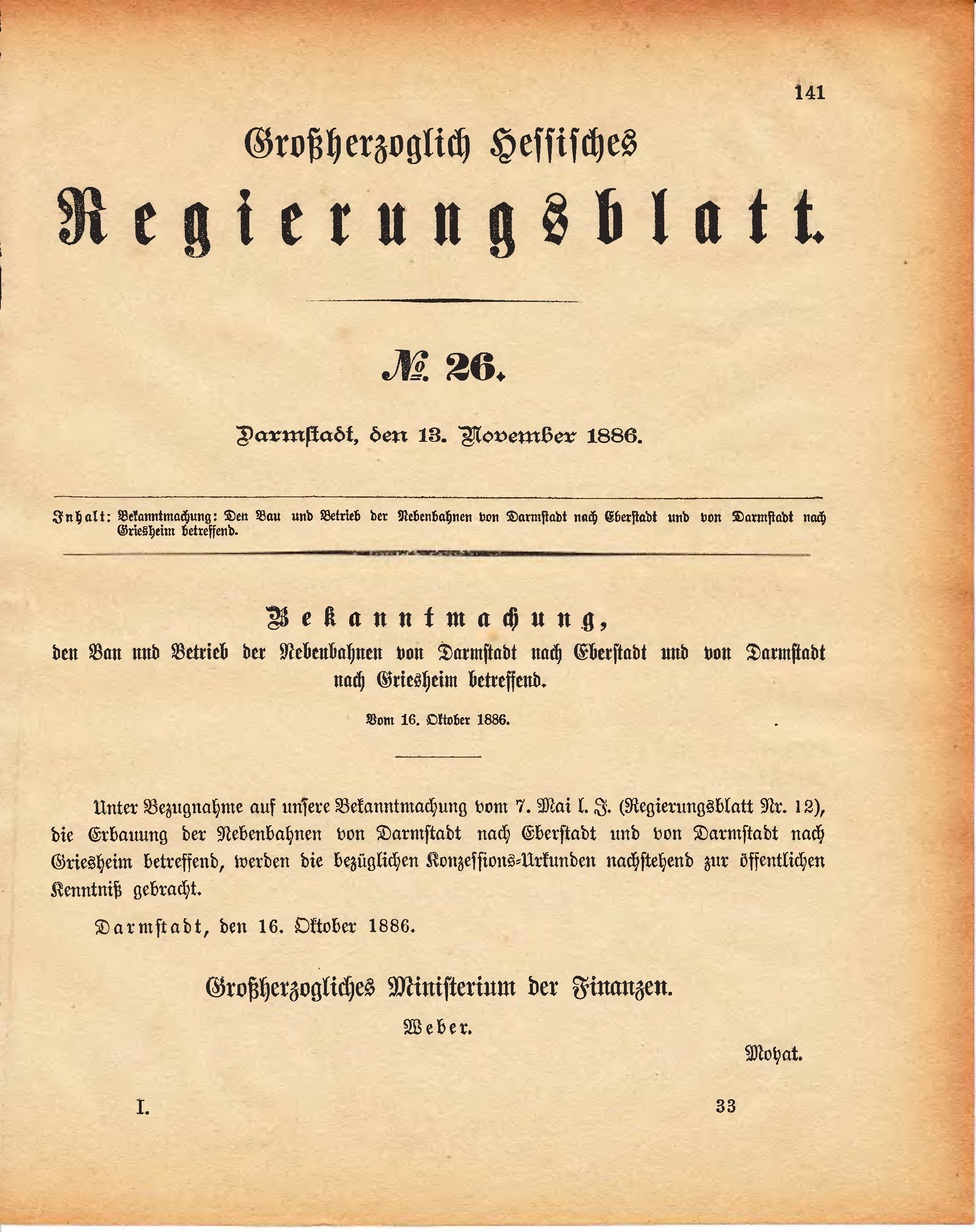 Unter Bezugnahme auf unsere Bekanntmachung vom 7. Mai l. J. (Regierungsblatt Nr. 12), die Erbauung der Nebenbahnen von Darmstadt nach Eberstadt und von Darmstadt nach Griesheim betreffend, werden die bezüglichen Konzessions-Urkunden nachstehend zur öffentlichen Kenntniß gebracht.