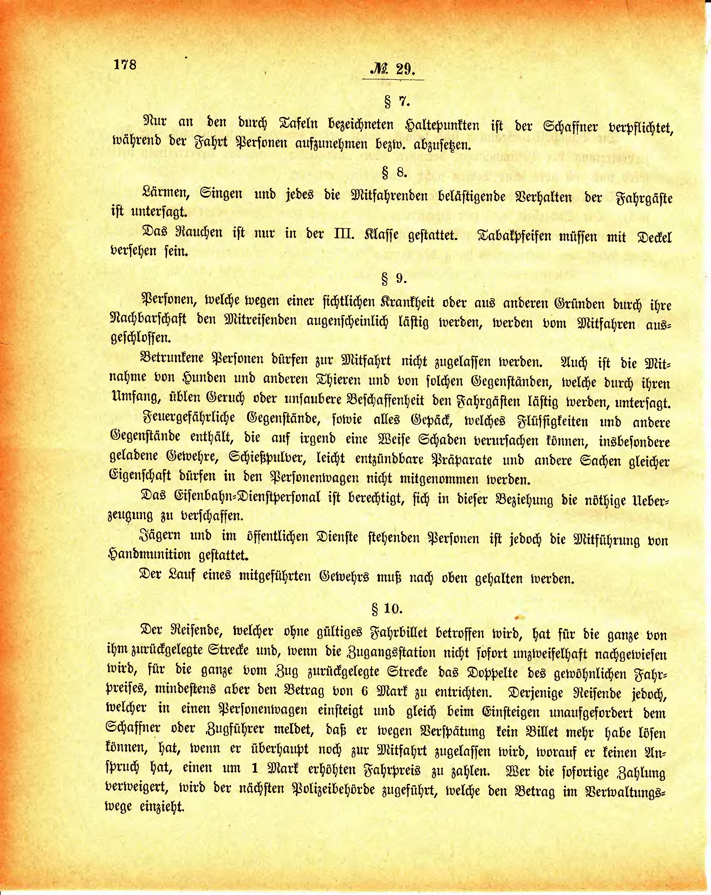 Betrunkene Personen dürfen zur Mitfahrt nicht zugelassen werden. Auch ist die Mitnahme von Hunden und anderen Thieren und von solchen Gegenständen, welche durch ihren Umfang, üblen Geruch oder unsaubere Beschaffenheit den Fahrgästen lästig werden, untersagt.