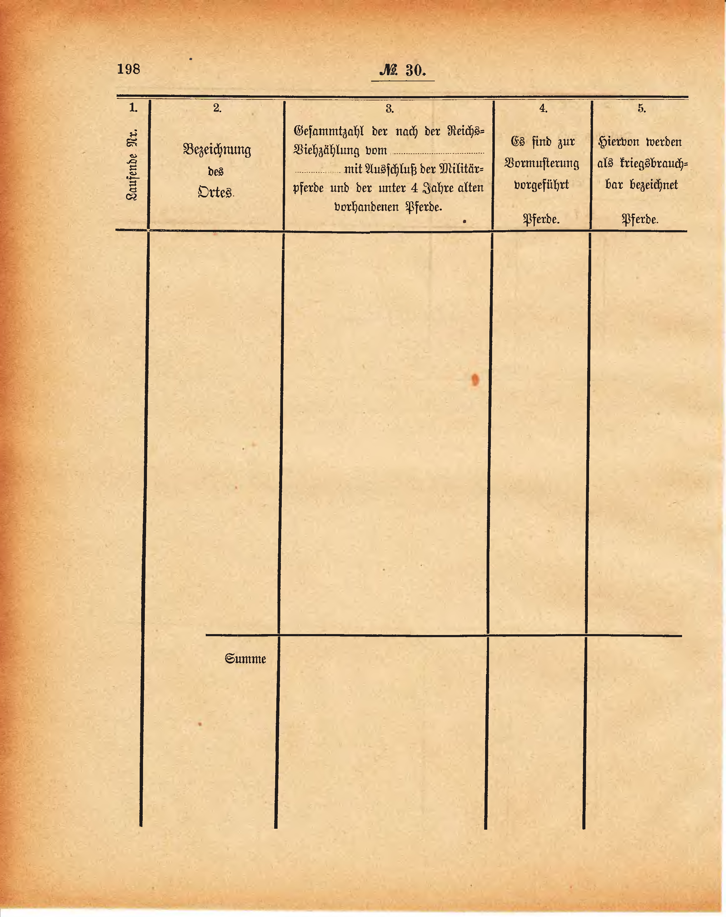 Viehzählung vom ..................... ........... mit Ausschluß der Militär- pferde und der unter 4 Jahre alten vorhandenen Pferde. |