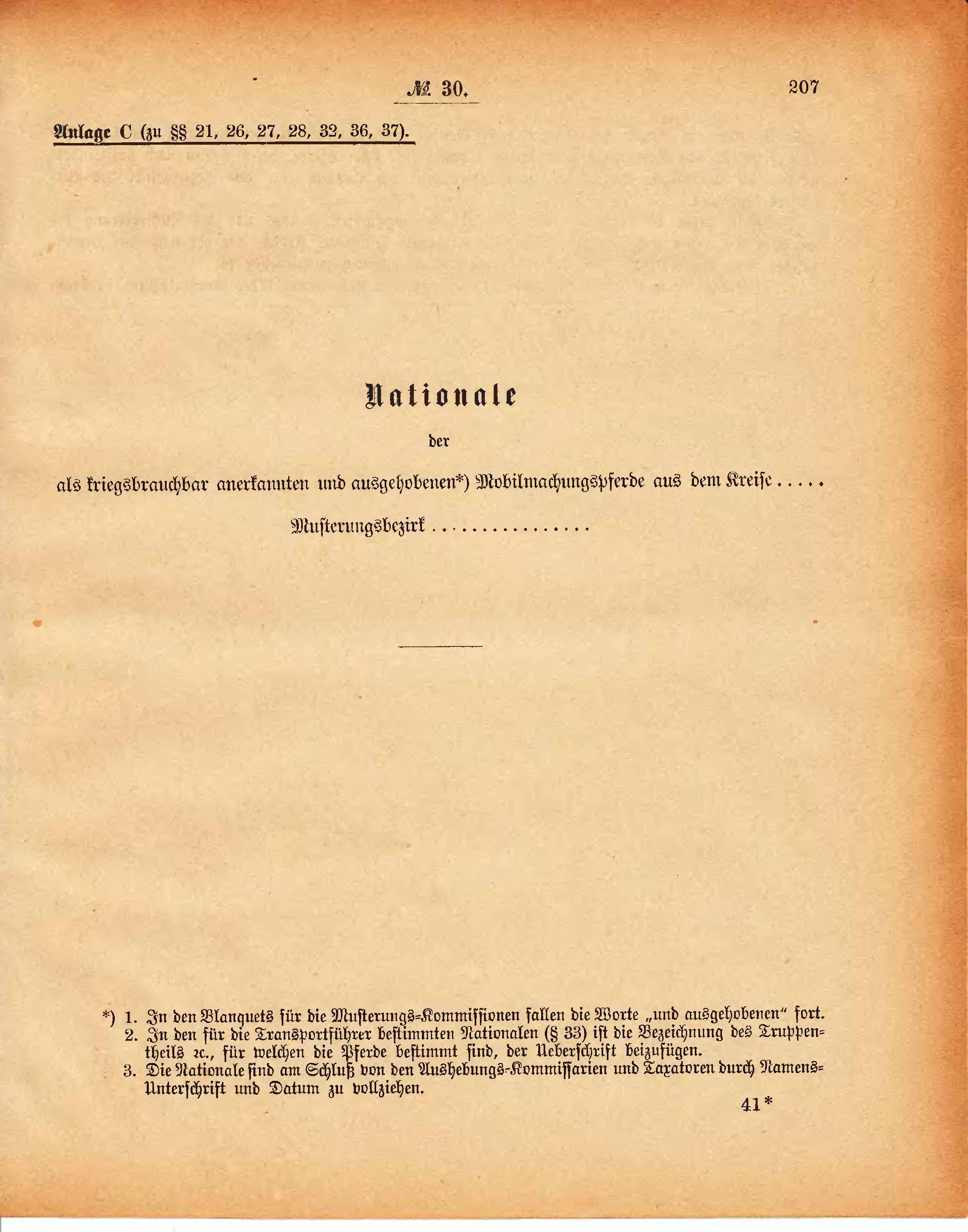 | 2. | In den für die Transportführer bestimmten Nationalen (§ 33) ist die Bezeichnung des Truppentheils etc., für welchen die Pferde bestimmt sind, der Ueberschrift beizufügen. | |