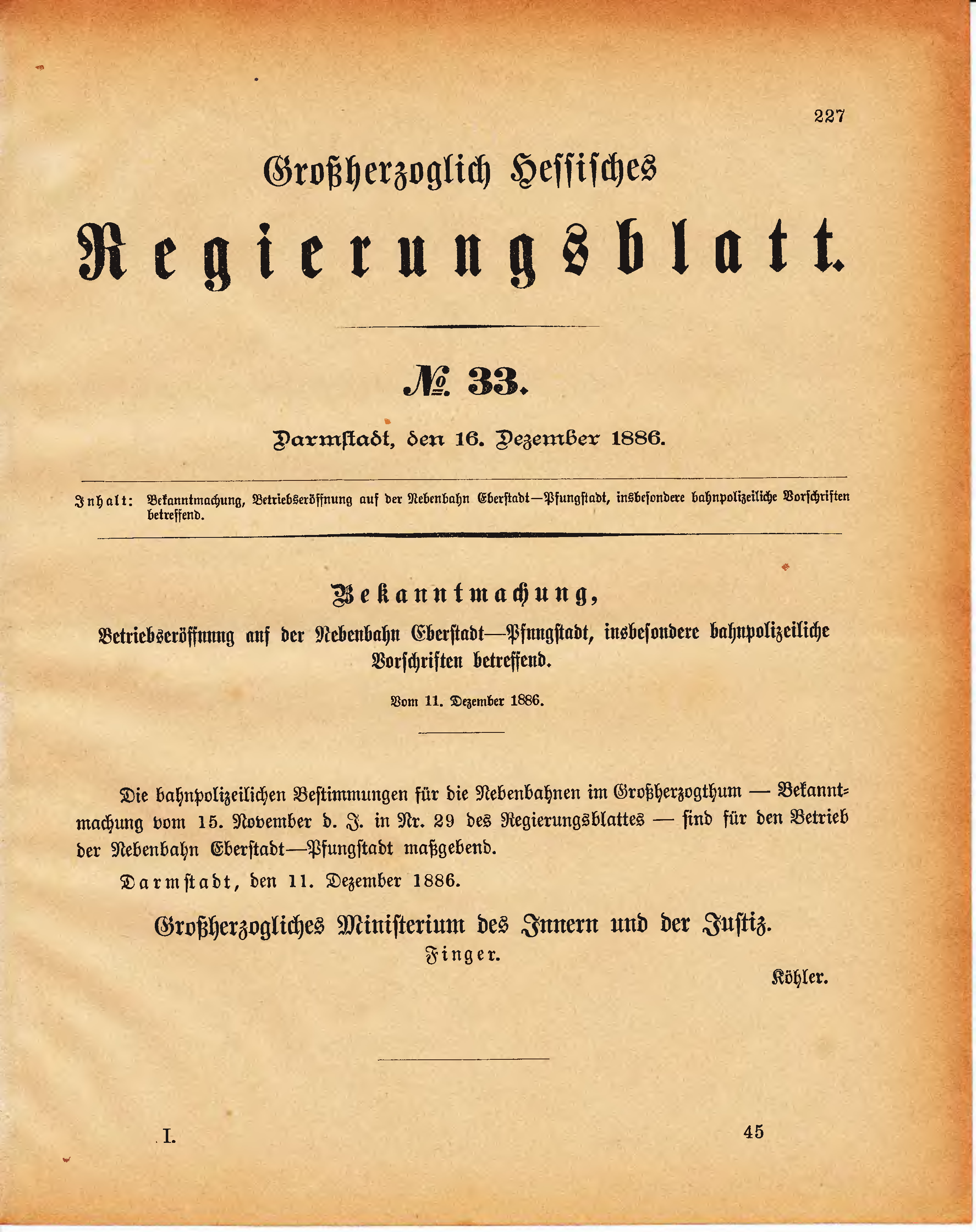 Die bahnpolizeilichen Bestimmungen für die Nebenbahnen im Großherzogthum - Bekanntmachung vom 15. November d. J. in Nr. 29 des Regierungsblattes - sind für den Betrieb der Nebenbahn Eberstadt - Pfungstadt maßgebend.