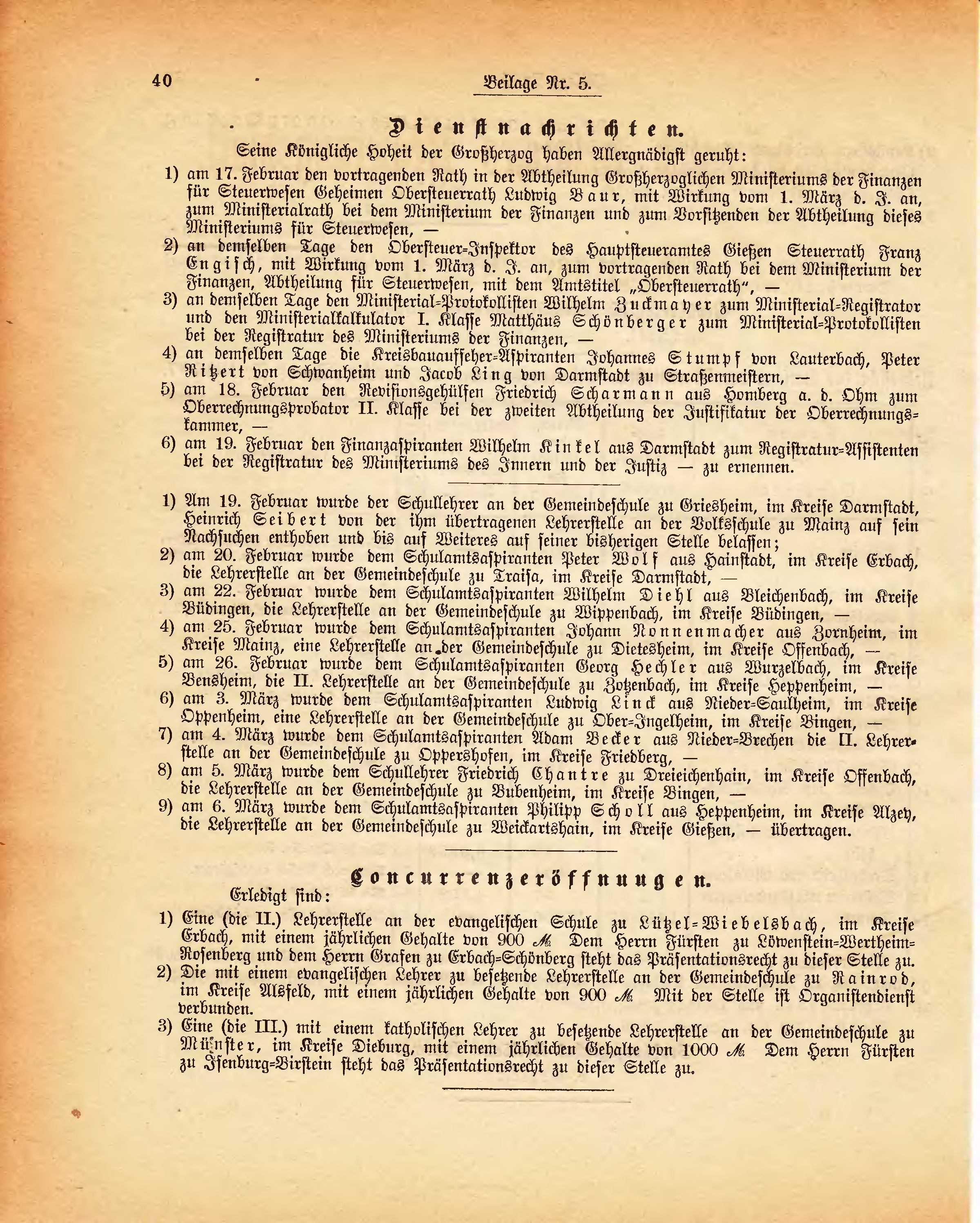 | 6) | am 19. Februar den Finanzaspiranten Wilhelm Kinkel aus Darmstadt zum Registratur-Assistenten bei der Registratur des Ministeriums des Innern und der Justiz - zu ernennen. |