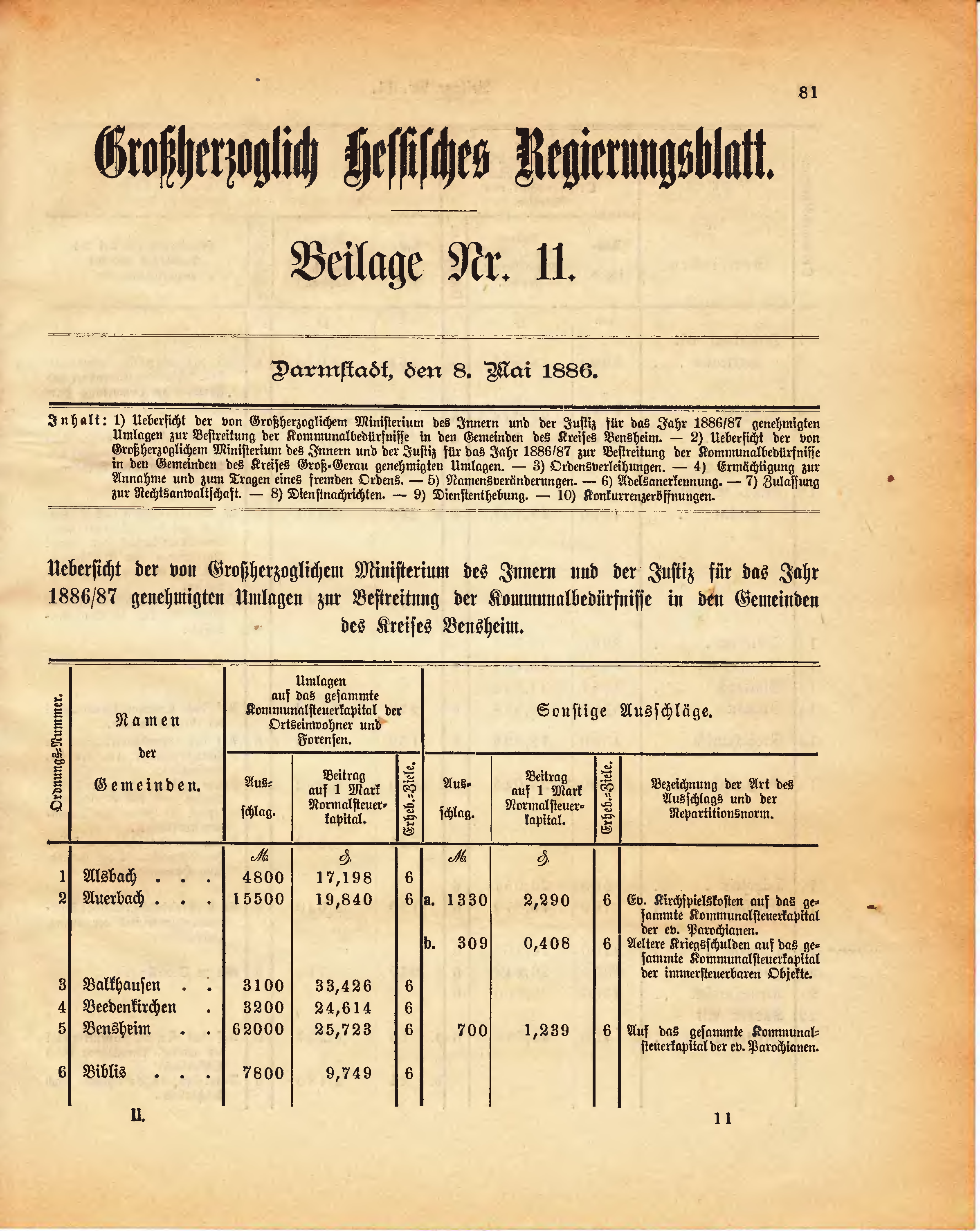 Uebersicht der von Großherzoglichem Ministerium des Innern und der Justiz für das Jahr 1886/87 genehmigten Umlagen zur Bestreitung der Kommunalbedürfnisse in den Gemeinden des Kreises Bensheim.