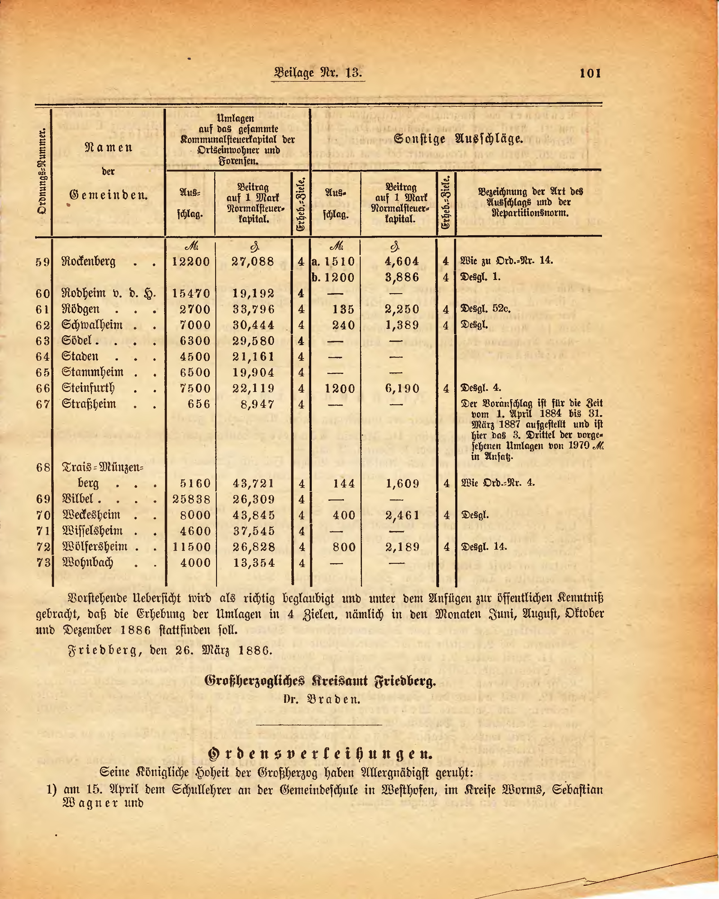 Vorstehende Uebersicht wird als richtig beglaubigt und unter dem Anfügen zur öffentlichen Kenntniß gebracht, daß die Erhebung der Umlagen in 4 Zielen, nämlich in den Monaten Juni, August, Oktober und Dezember 1886 stattfinden soll.