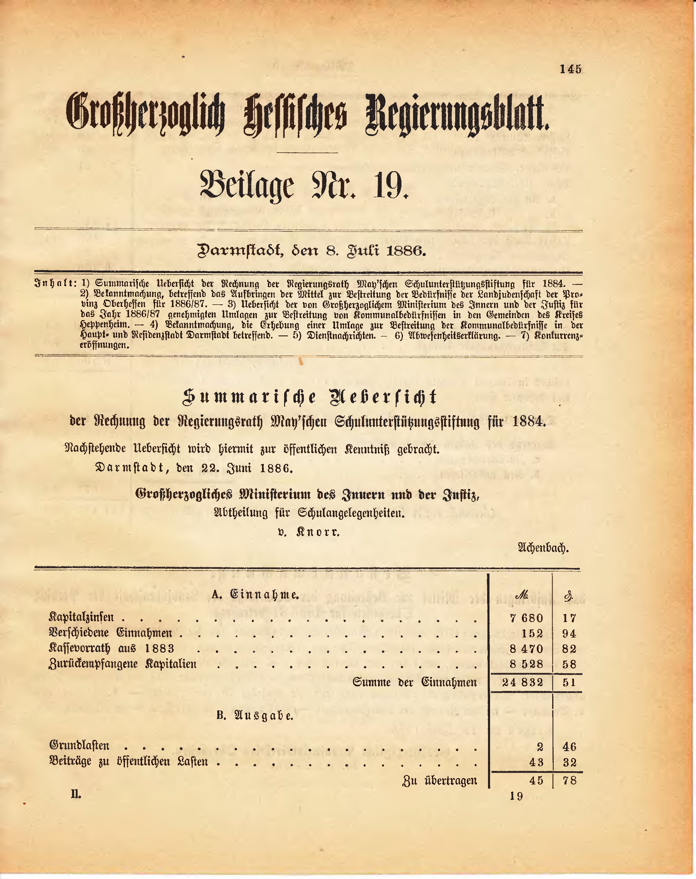 | Inhalt: | 1) Summarische Uebersicht der Rechnung der Regierungsrath May`schen Schulunterstützungsstiftung für 1884. - 2) Bekanntmachung, betreffend das Aufbringen der Mittel zur Bestreitung der Bedürfnisse der Landjudenschaft der Provinz Oberhessen für 1886/87. - 3) Uebersicht der von Großherzoglichem Ministerium des Innern und der Justiz für das Jahr 1886/87 genehmigten Umlagen zur Bestreitung von Kommunalbedürfnissen in den Gemeinden des Kreises Heppenheim. - 4) Bekanntmachung, die Erhebung einer Umlage zur Bestreitung der Kommunalbedürfnisse in der Haupt- und Residenzstadt Darmstadt betreffend. - 5) Dienstnachrichten. - 6) Abwesenheitserklärung. - 7) Konkurrenzeröffnungen. |