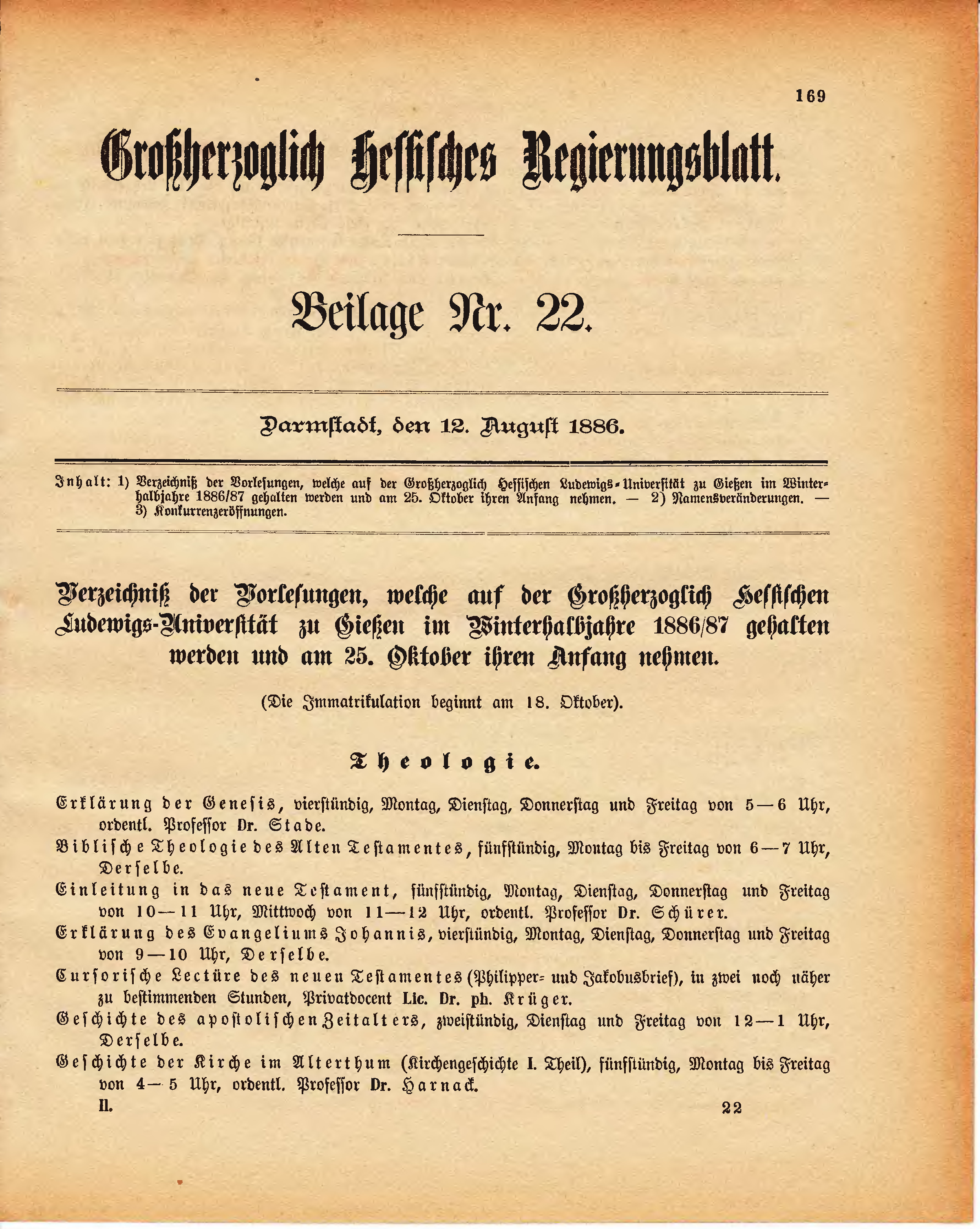 | Inhalt: | 1) Verzeichniß der Vorlesungen, welche auf der Großherzoglich Hessischen Ludewigs-Universität zu Gießen im Winterhalbjahre 1886/87 gehalten werden und am 25. Oktober ihren Anfang nehmen. - 2) Namensveränderungen. - 3) Konkurrenzeröffnungen. |